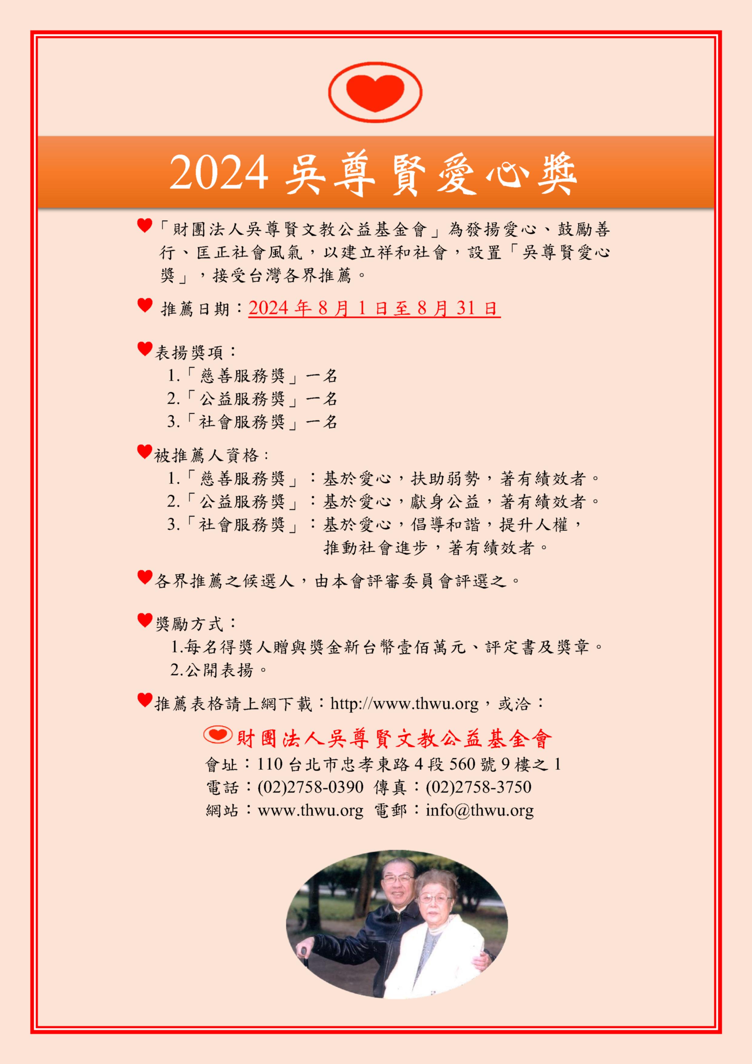轉知財團法人吳尊賢文教公益基金會辦理「2024吳尊賢愛心獎」資訊: