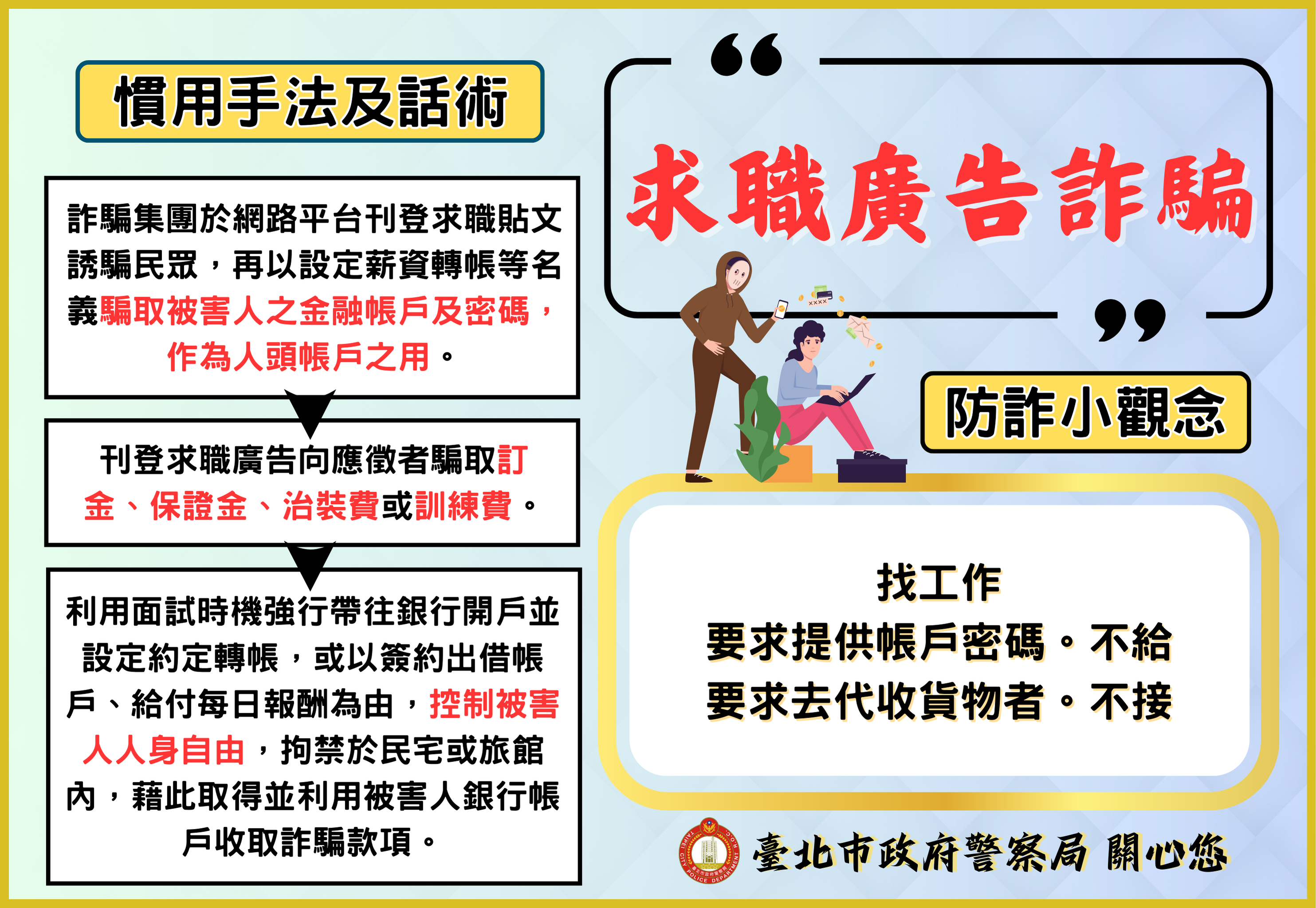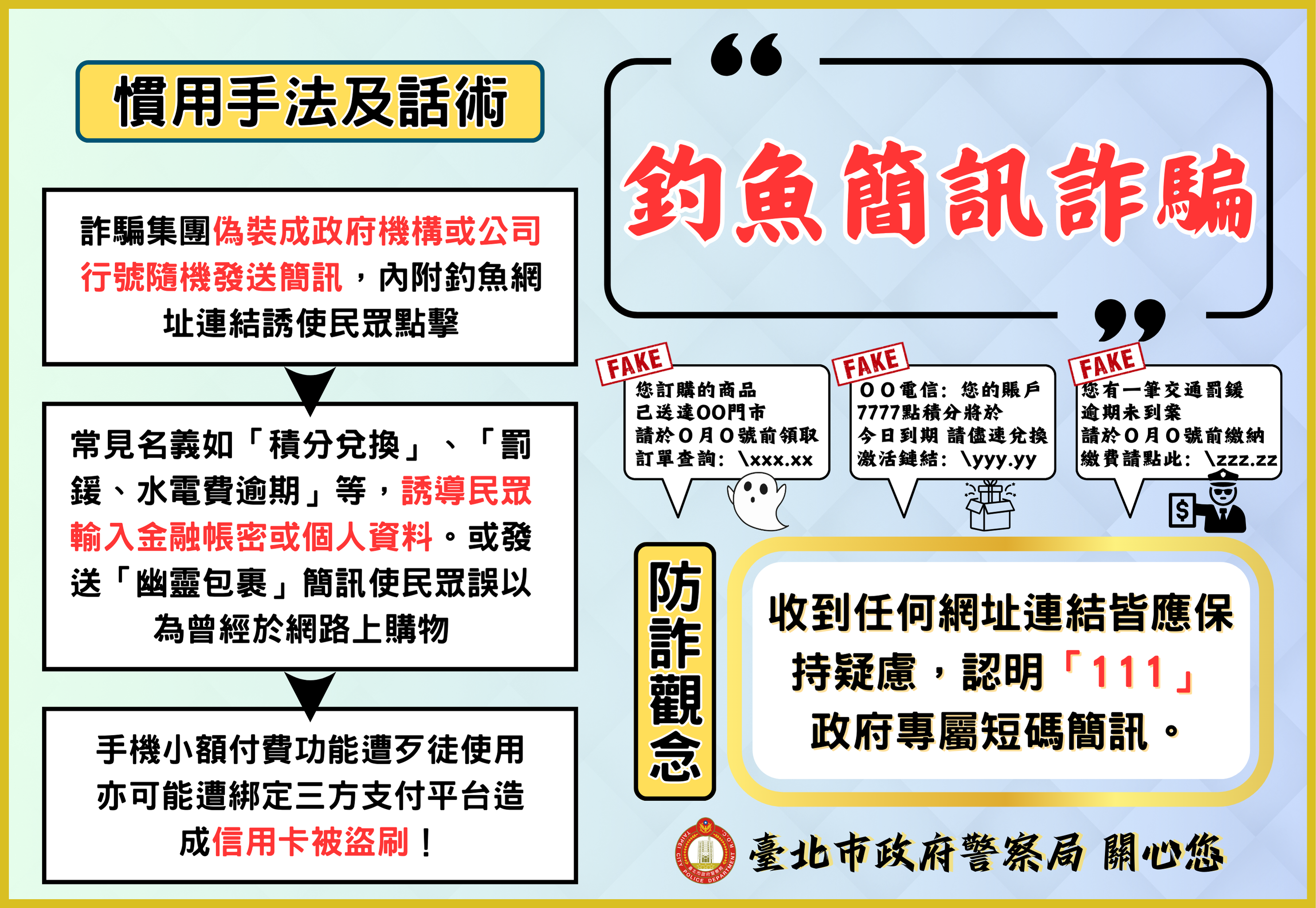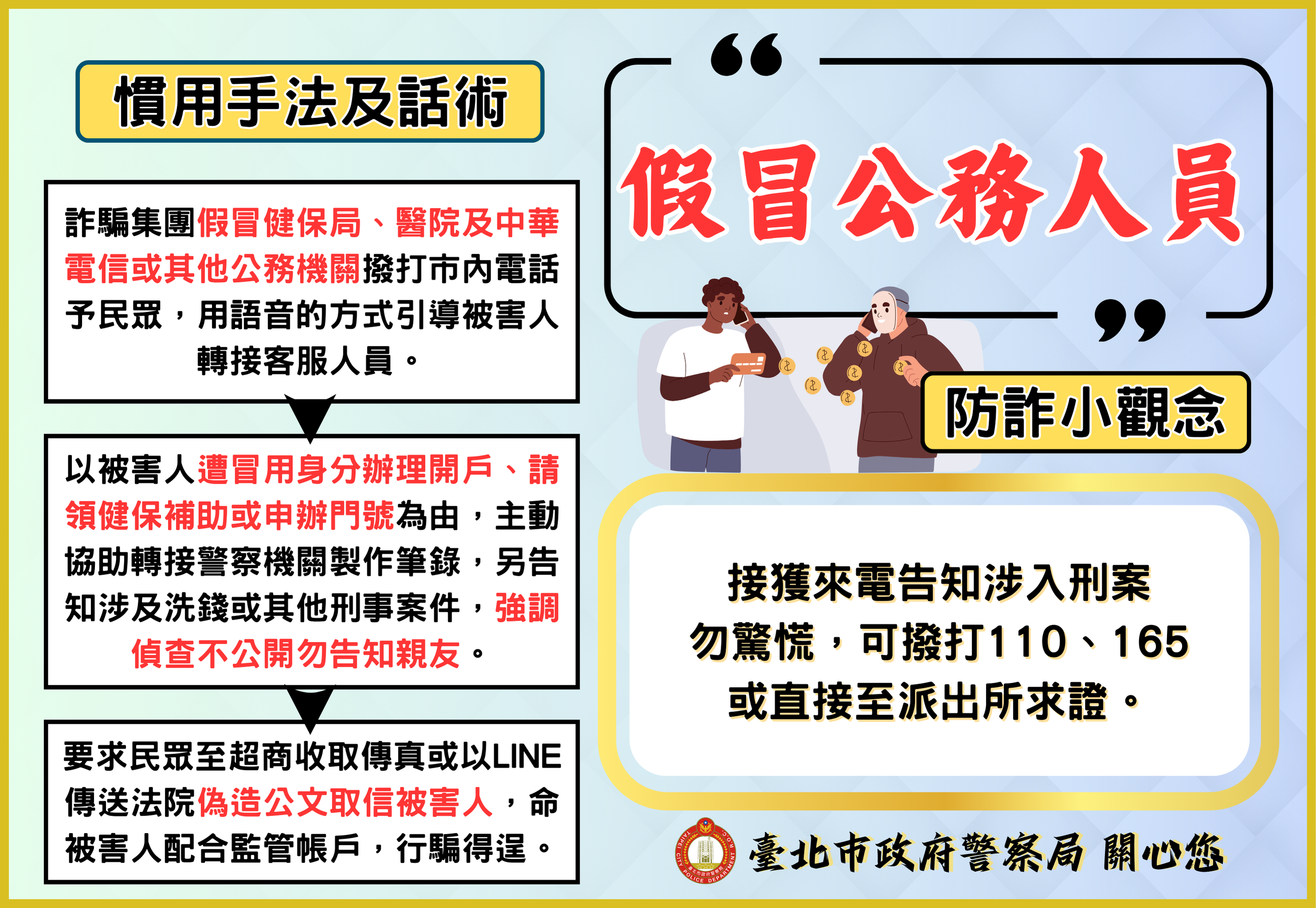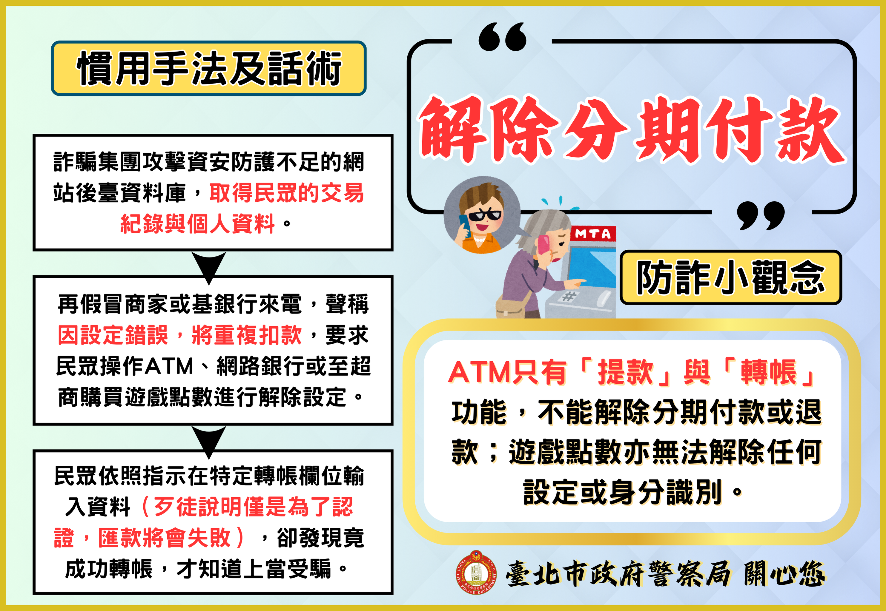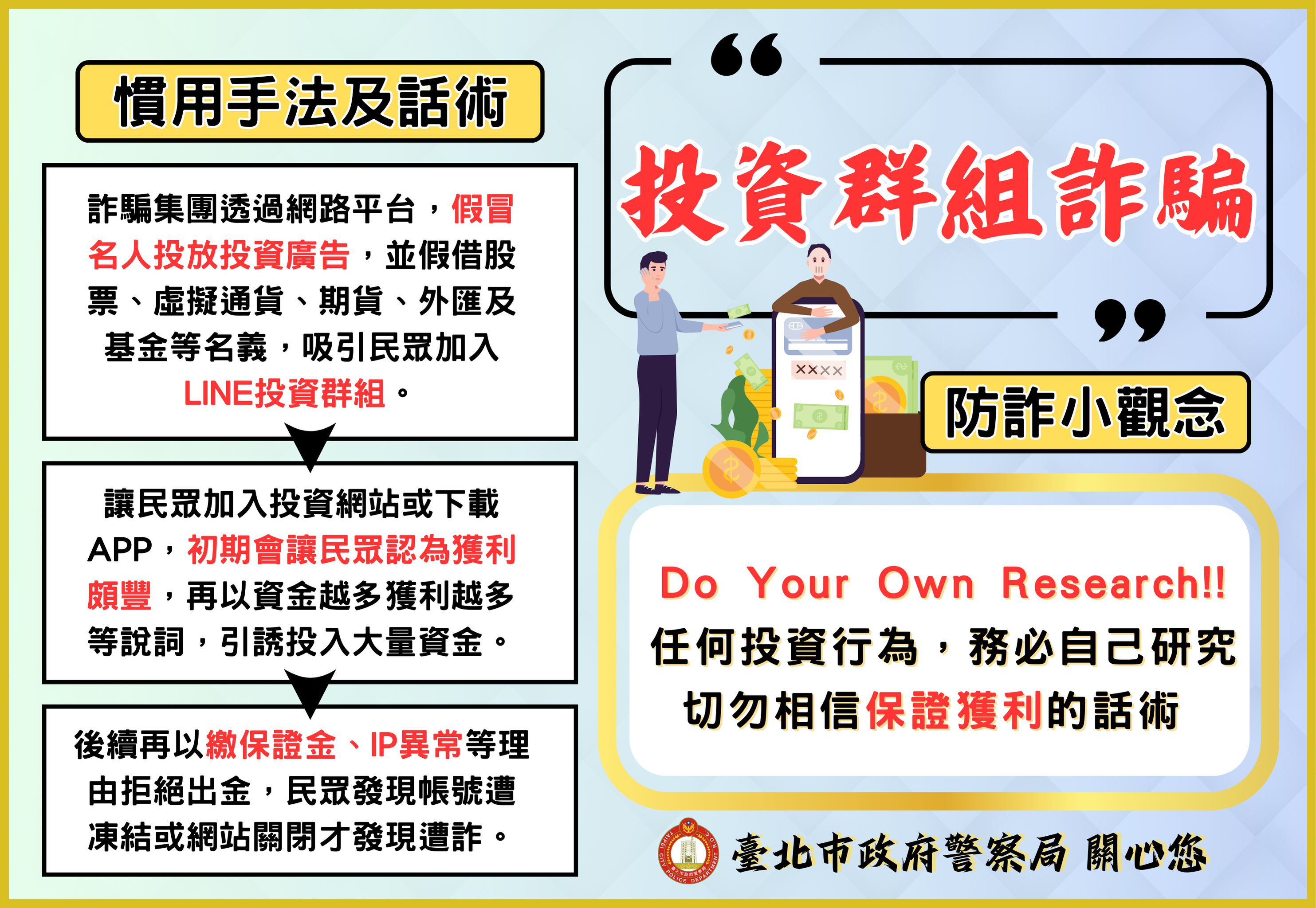 二、為賡續落實本市分齡分眾識詐宣導教育,本月以假投資詐騙、二次詐騙等8大常見詐騙案例情境為宣導主軸,彙整反