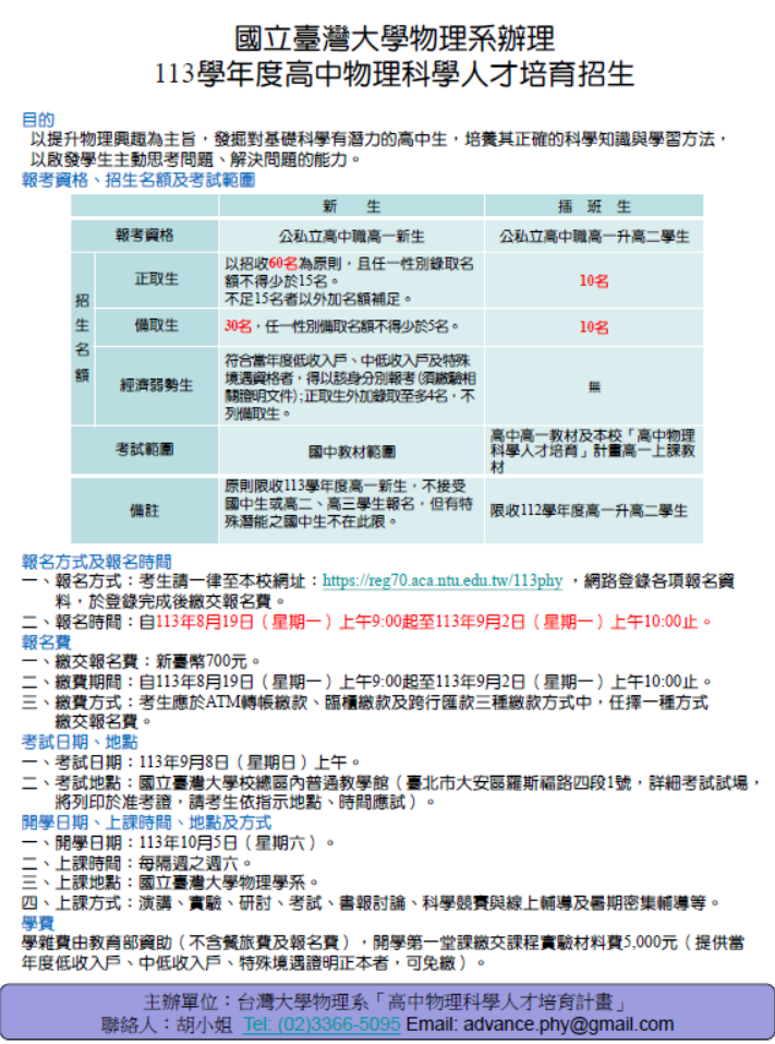 培養未來物理科學研究人才,特舉辦旨揭招生考試。請同學踴躍報名!