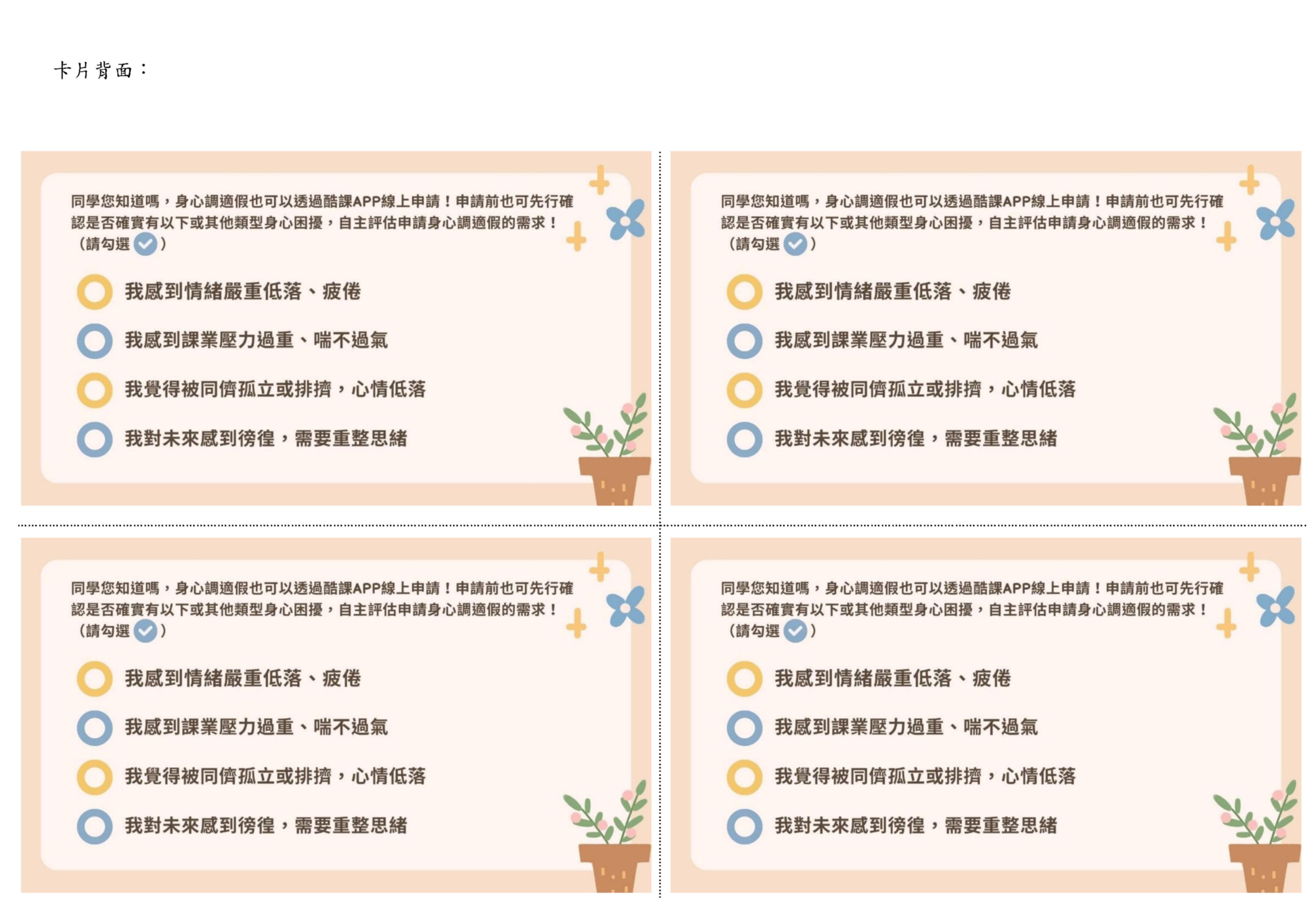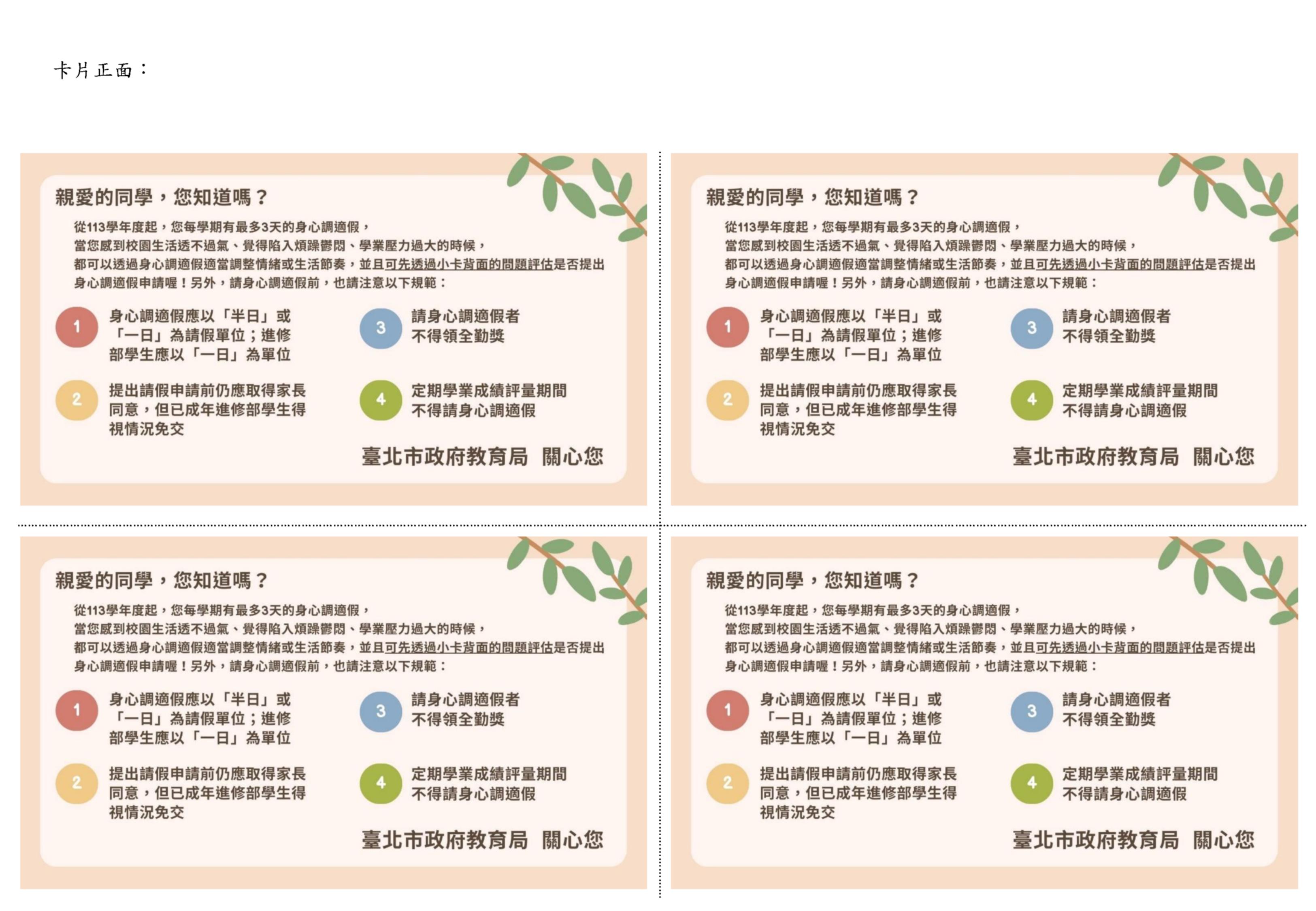 三、另為順利推動各校學生認識身心調適假,並貫徹身心調適假之設立初衷,本局設計「臺北市高級中等學校身心調適假宣導小卡」。