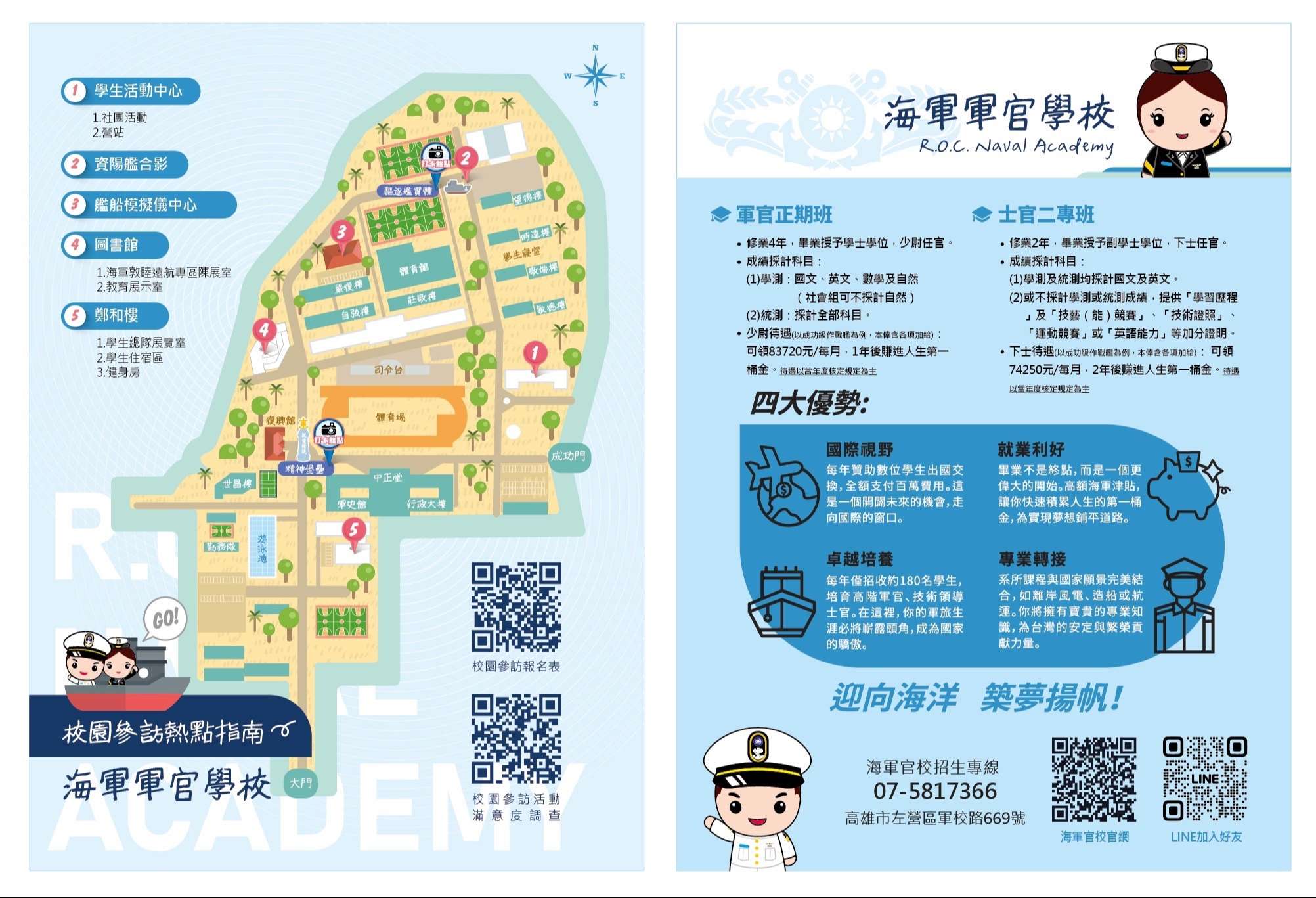 二、該校訂於113年9月6日起每週五1400至1600時辦理校區開放活動,可視參訪學校需要(如全民國防教育活動、校外教 學活動等等)配合專場接待,來增進對海軍官校之認識, 請各校運用學校網站協助宣導參訪相關活動說明及指南, 以提供學生與家長就學活動資訊,其報名及聯絡方式說明如下: