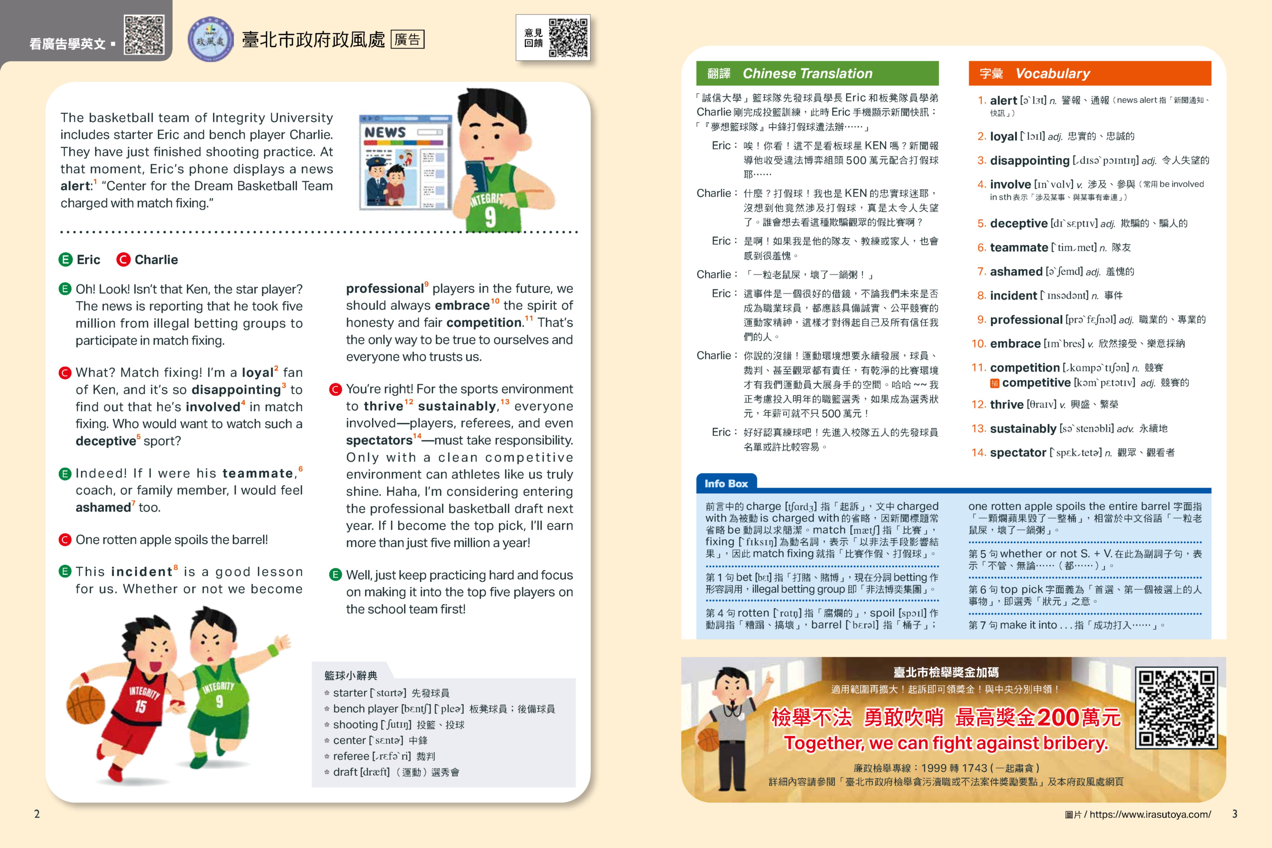 為響應我國2030雙語政策整體推動方案及「本市推動品德教育實施計畫」,本府政風處與英語學習雜誌「Live互動英語雜誌」合作刊登跨頁英語誠信短篇故事(如下圖),該雜誌2024年9月號業於各大書店販售。