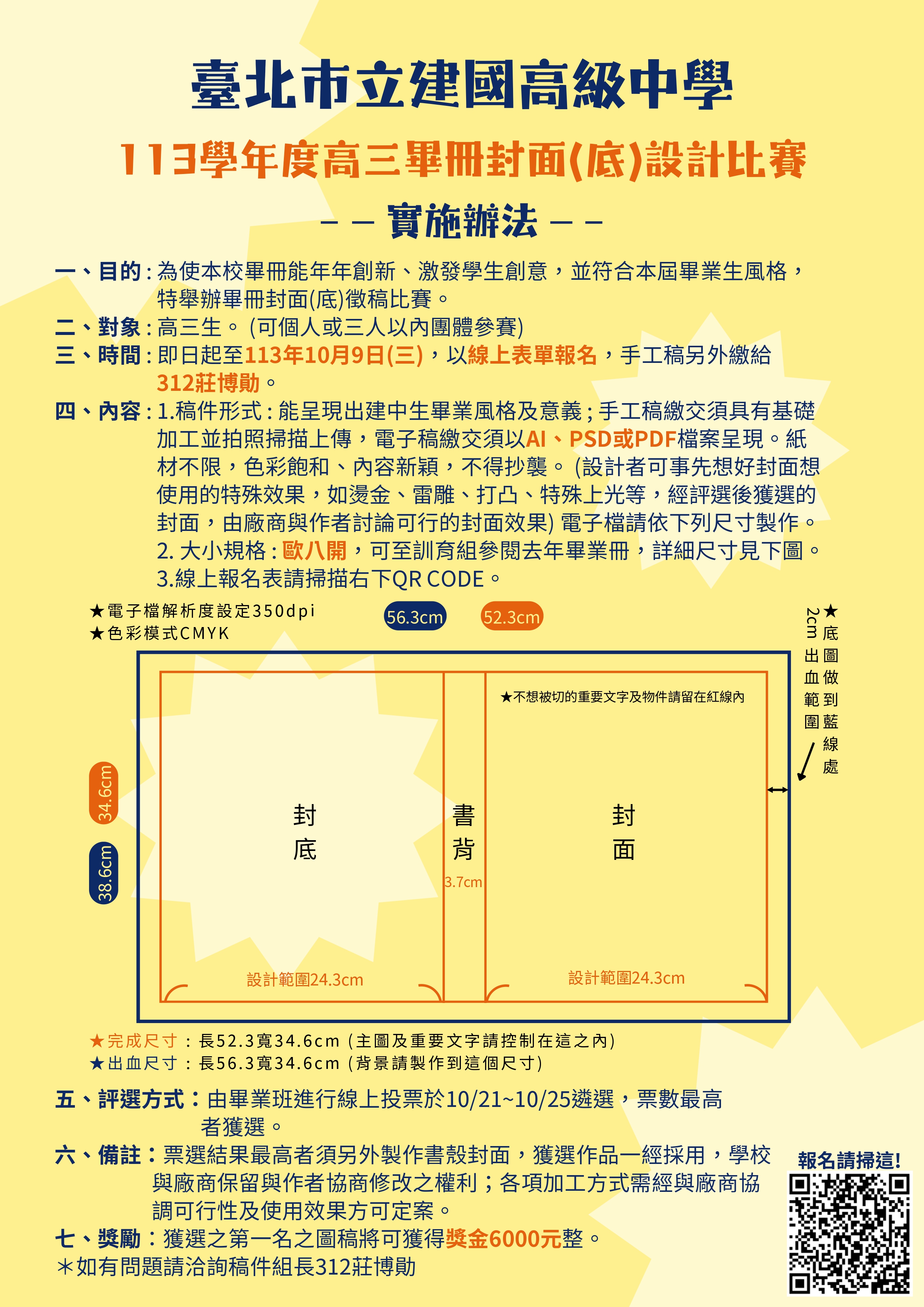 113學年度高三畢冊封面(底)徵稿收件時間延長至113/10/16(三),歡迎有興趣的高三同學投稿!