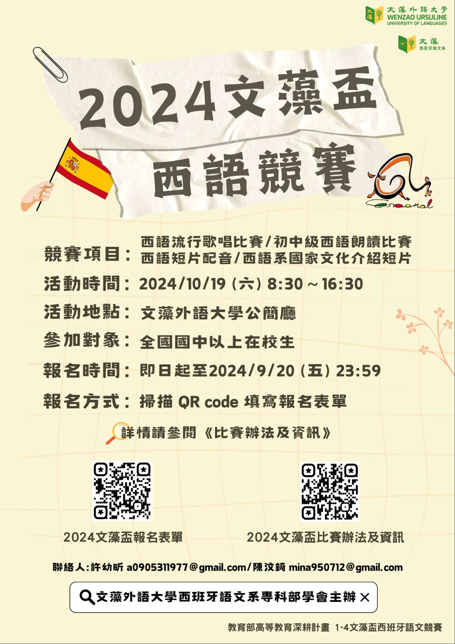 四、詳細競賽辦法請參閱附件,相關資訊亦可至本校西班牙語文系專科部學會網站(FB:https://zh-tw.facebook.com/wzesc/或IG:https://www.instagram.com/wzu.es/)查詢。