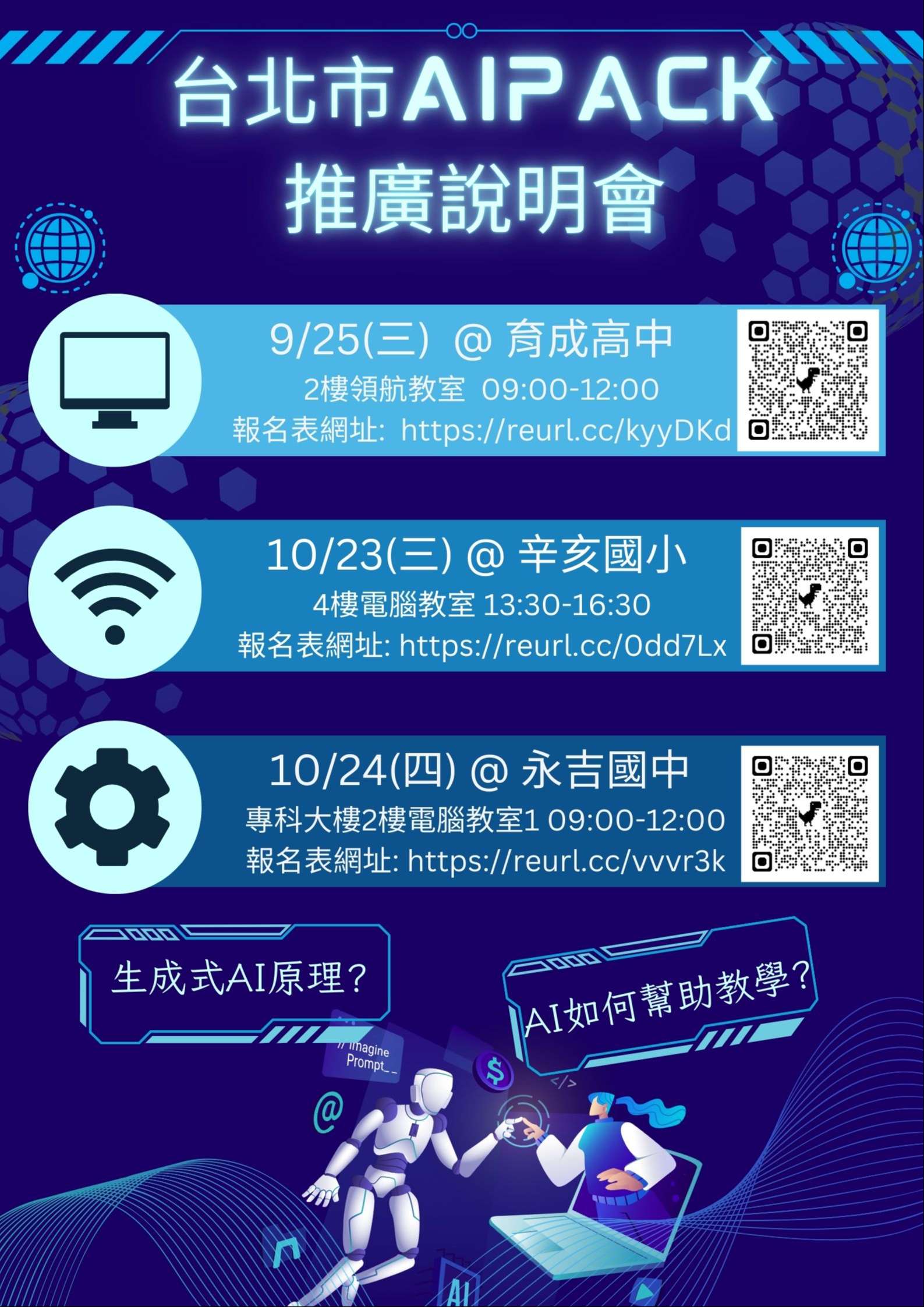 教育部師資培育及藝術教育司委請國立臺中教育大學(以下簡稱中教大)辦理「職前與在職教師AIPACK課程推動與教學能力提升計畫」之「113學年度AIPACK縣市推廣說明會」。為協助職前及在職教師掌握AI工具使用,提升教學品質和學生學習成效,由北市育成高中「臺北市數位學習推動辦公室」(以下簡稱推辦)和國立臺中教育大學「測驗統計與適性學習研究中心」,協力規劃旨揭方案研習課程共計3場次。歡迎教師報名參加,詳細資訊請見附件檔案,謝謝~