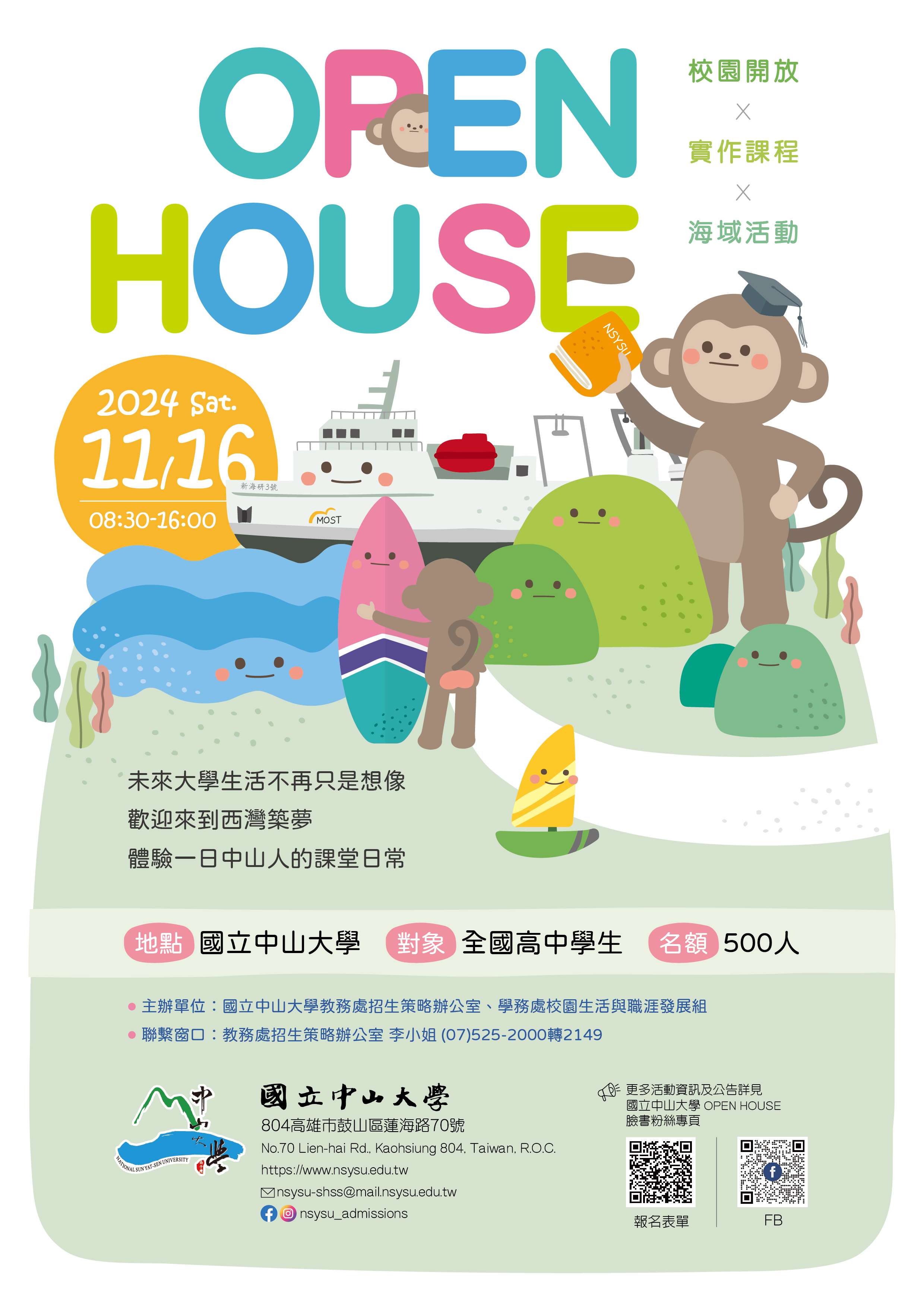 三、相關資訊可參考附件海報,或至本活動網站中山大學OPEN HOUSE之臉書粉絲專頁https://www.facebook.com/NSYSUopenhouse查詢。