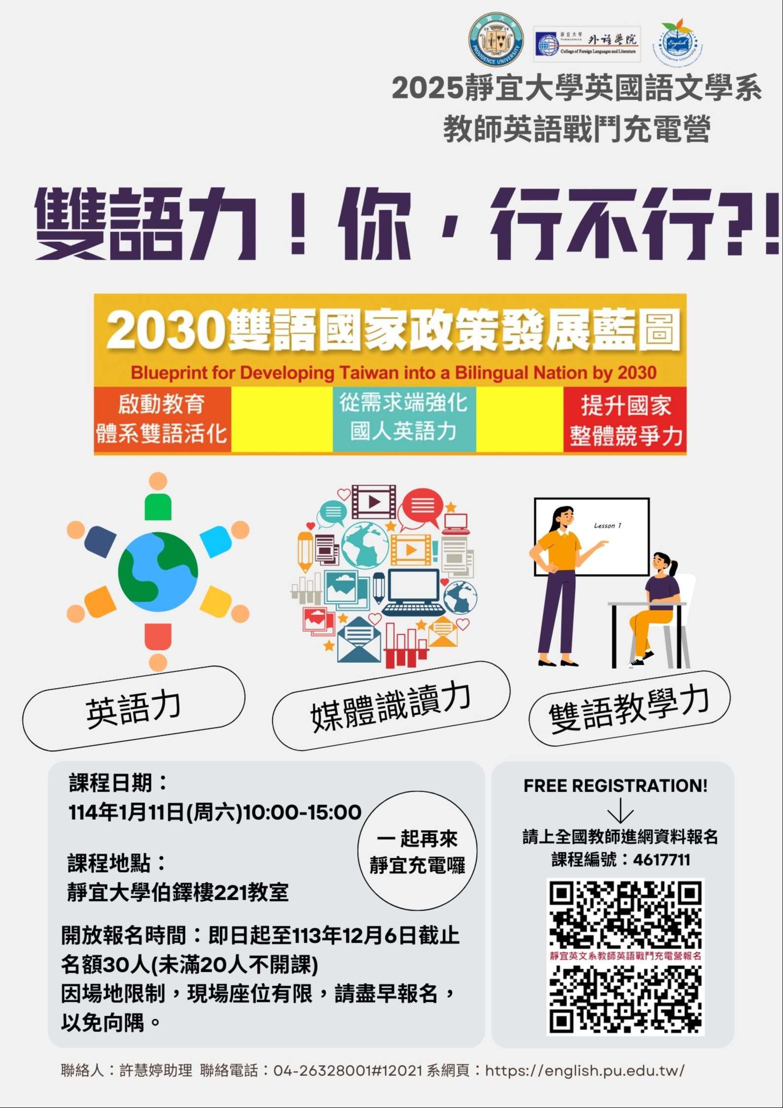 一、2030台灣即將邁入雙語政策國家,為提升教學第一線老師英語能力與媒體識讀力,特舉辦本研習營。