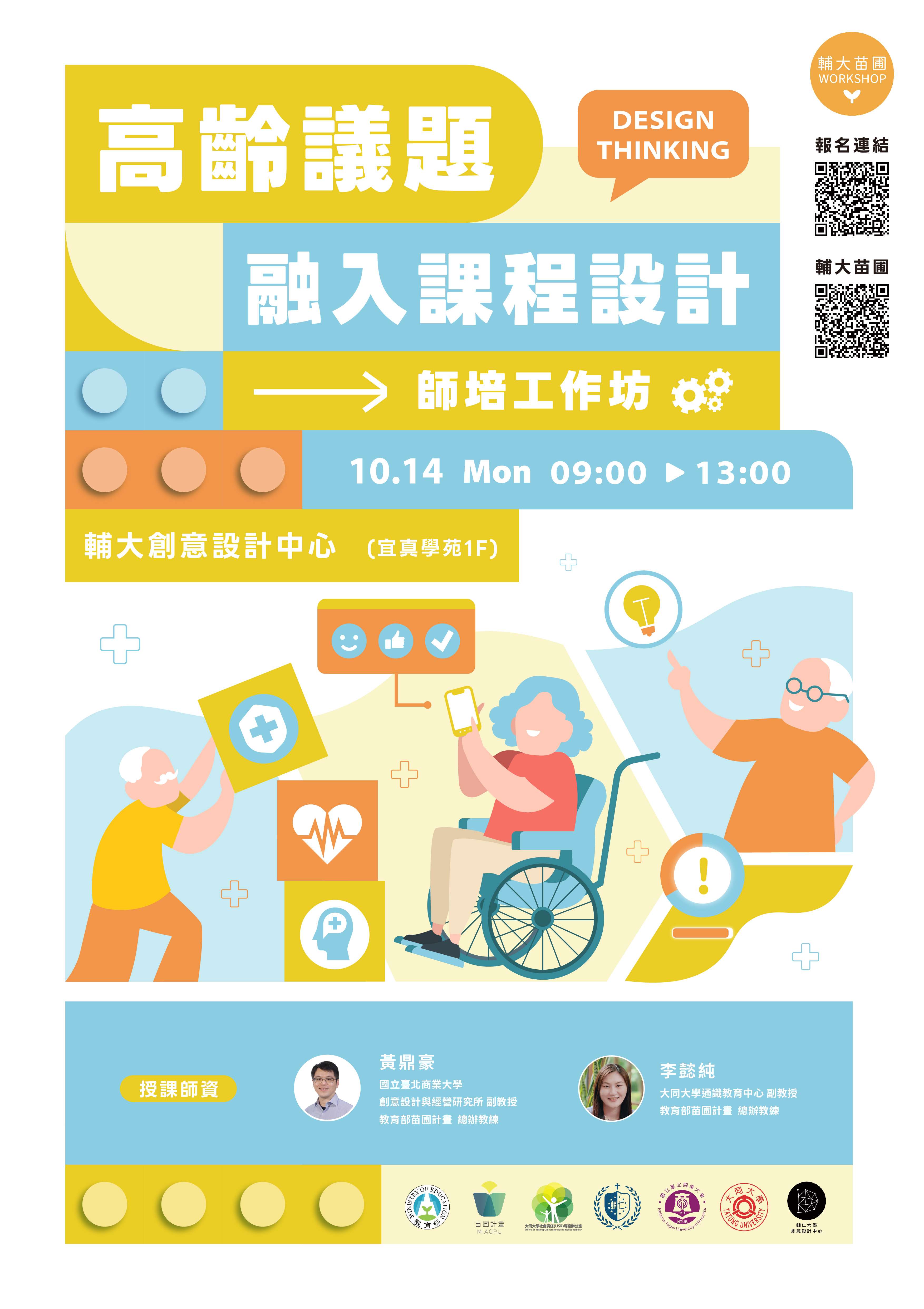 一、活動目的:本活動由教育部「跨領域教師發展暨人才培育計畫」補助辦理,本工作坊將以高齡議題為方向,引導教師共創並深入探索議題內涵,於探索過程中反思自我課程 的對接與鏈結。期望協助教師於本工作坊後,即有一個可行且兼具真實議題之課程模組,並透過模組引導學生實作、思考「高齡社會」議題及高齡者的需求與痛點分析, 並提出相對應的社會問題解決方案。