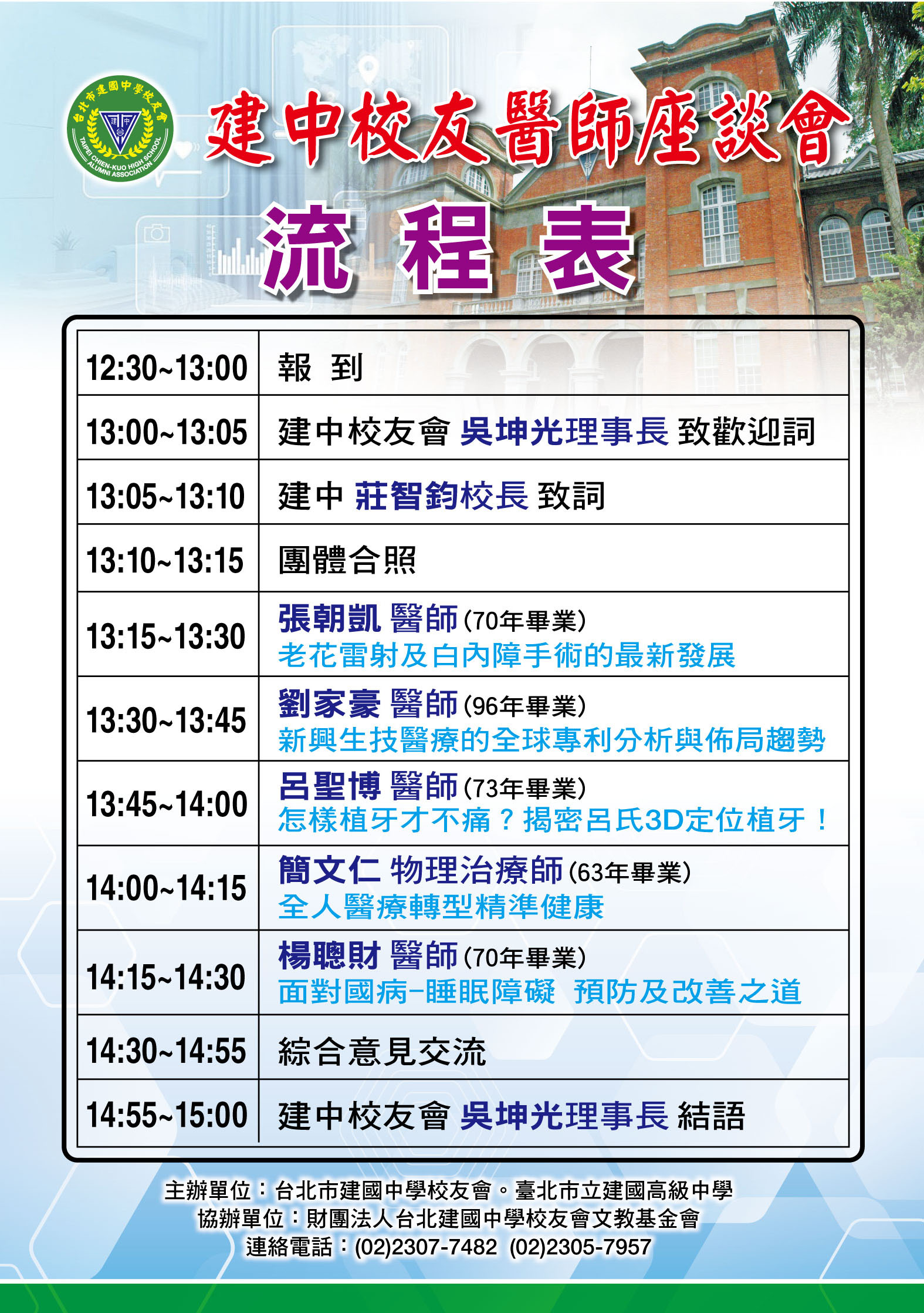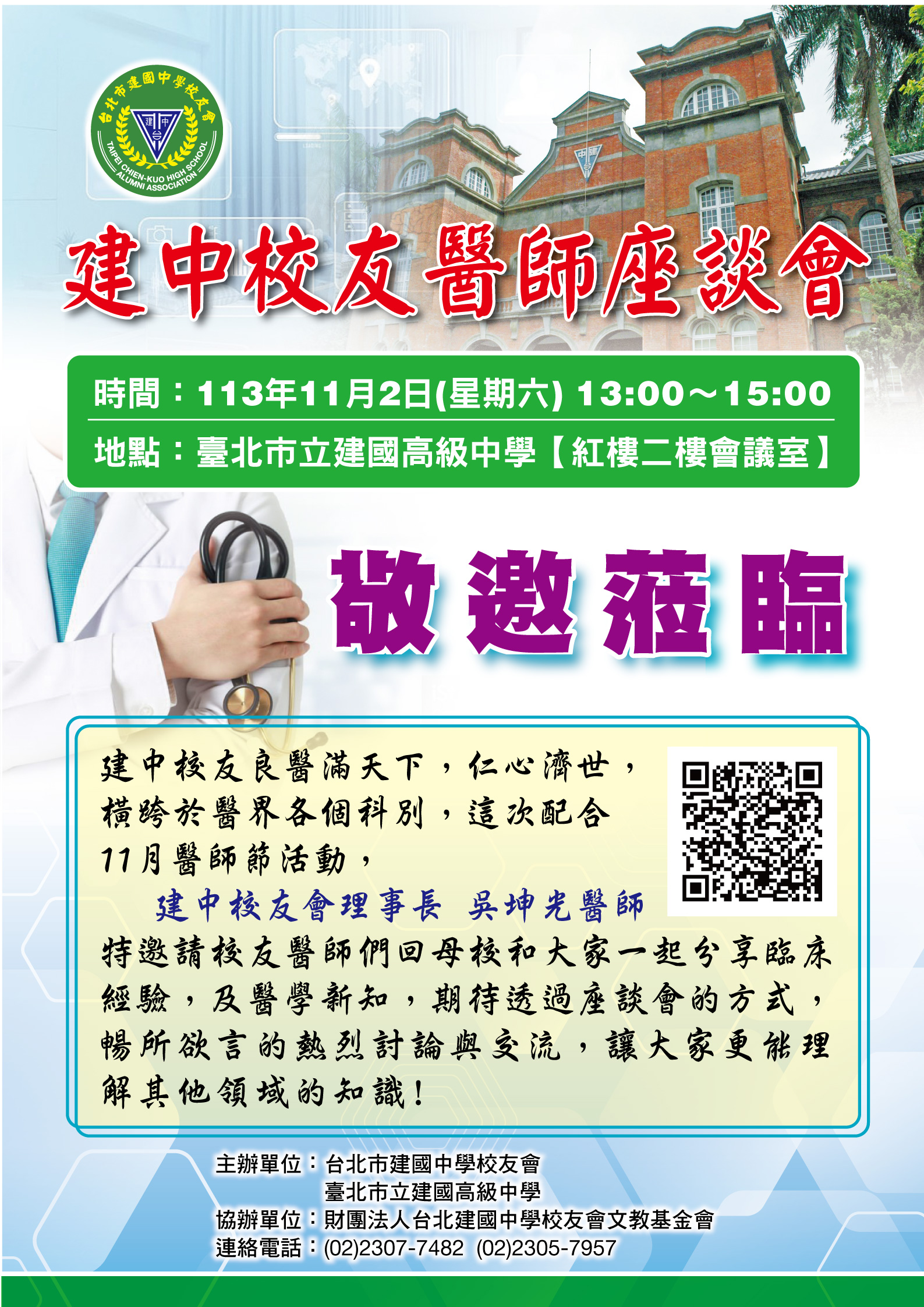 這次配合11月醫師節慶祝活動,建中校友會理事長 吳坤光醫師特邀請校友醫師們回母校和大家一起分享臨床經驗,及醫學新知,期待透過座談會的方式,暢所欲言的熱烈討論與交流,讓大家更能理解其他領域的知識!