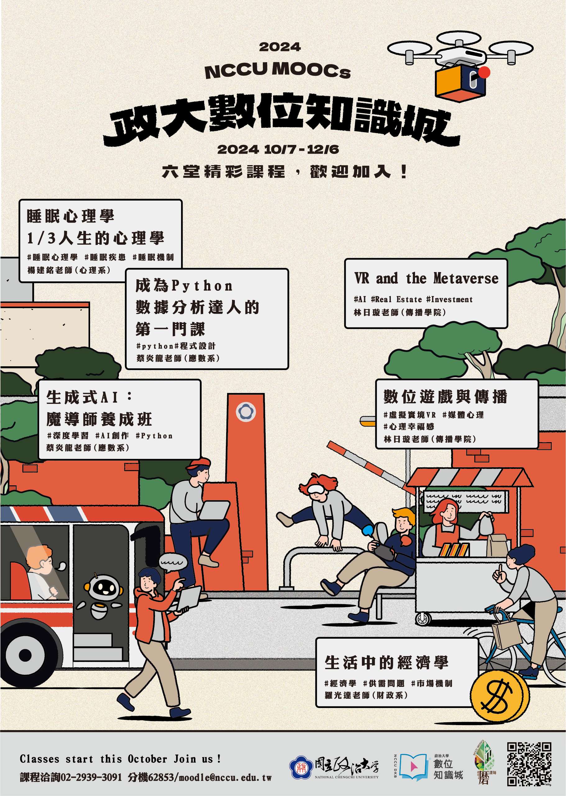 一、本校於政大數位知識城平台113學年度第1學期開設6門磨課師線上課程,即日起開放線上註冊報名。