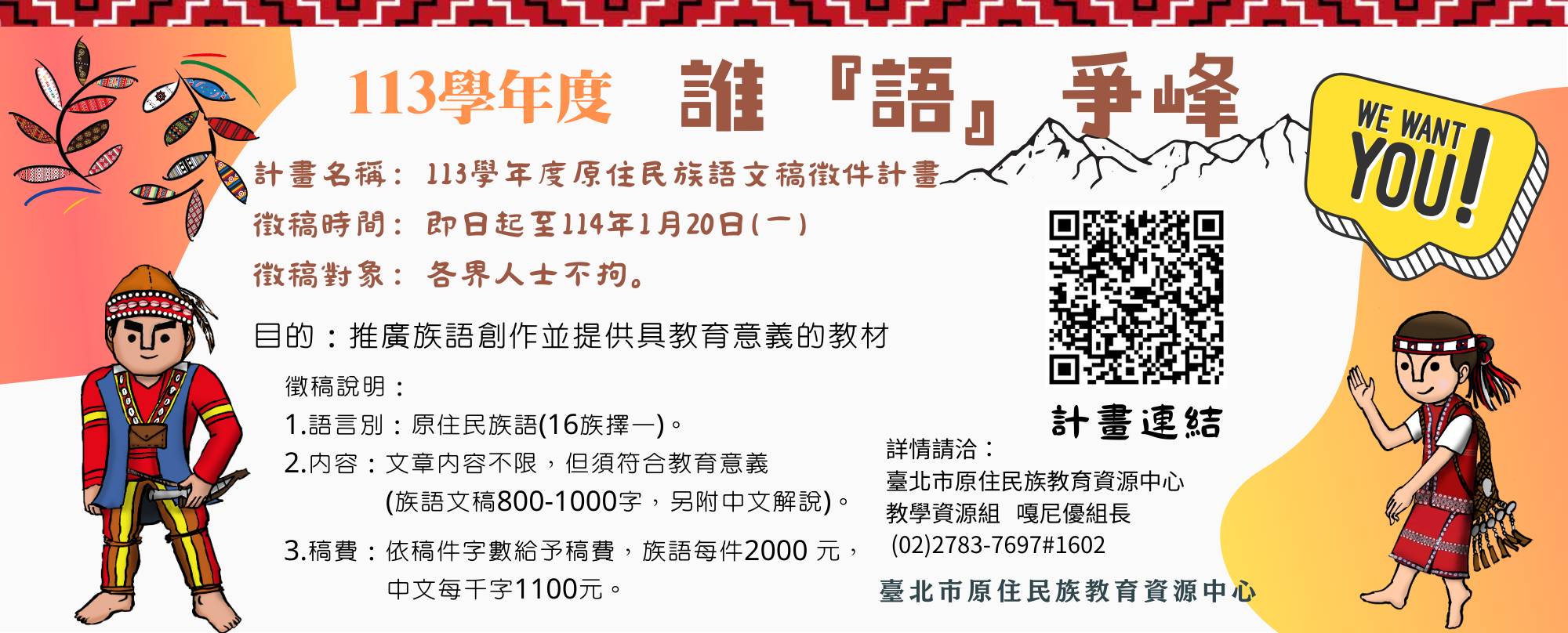 2、內容:文章內容不限,但須符合教育意義(族語文稿800-1000字,另附中文解說)。