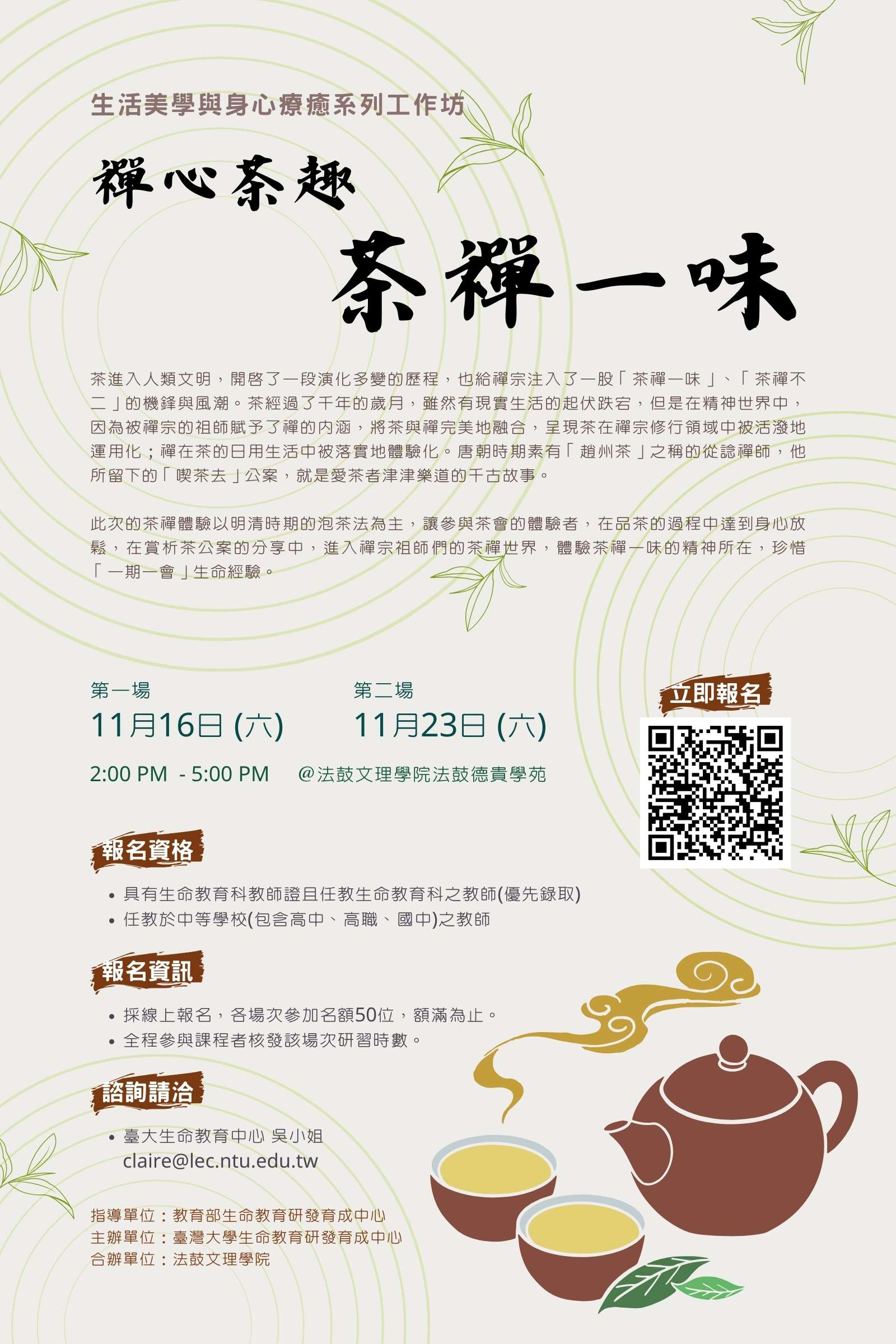轉知國立臺灣大學生命教育研發育成中心辦理「生活美學與身心療 癒系列工作坊-茶禪一味」簡章