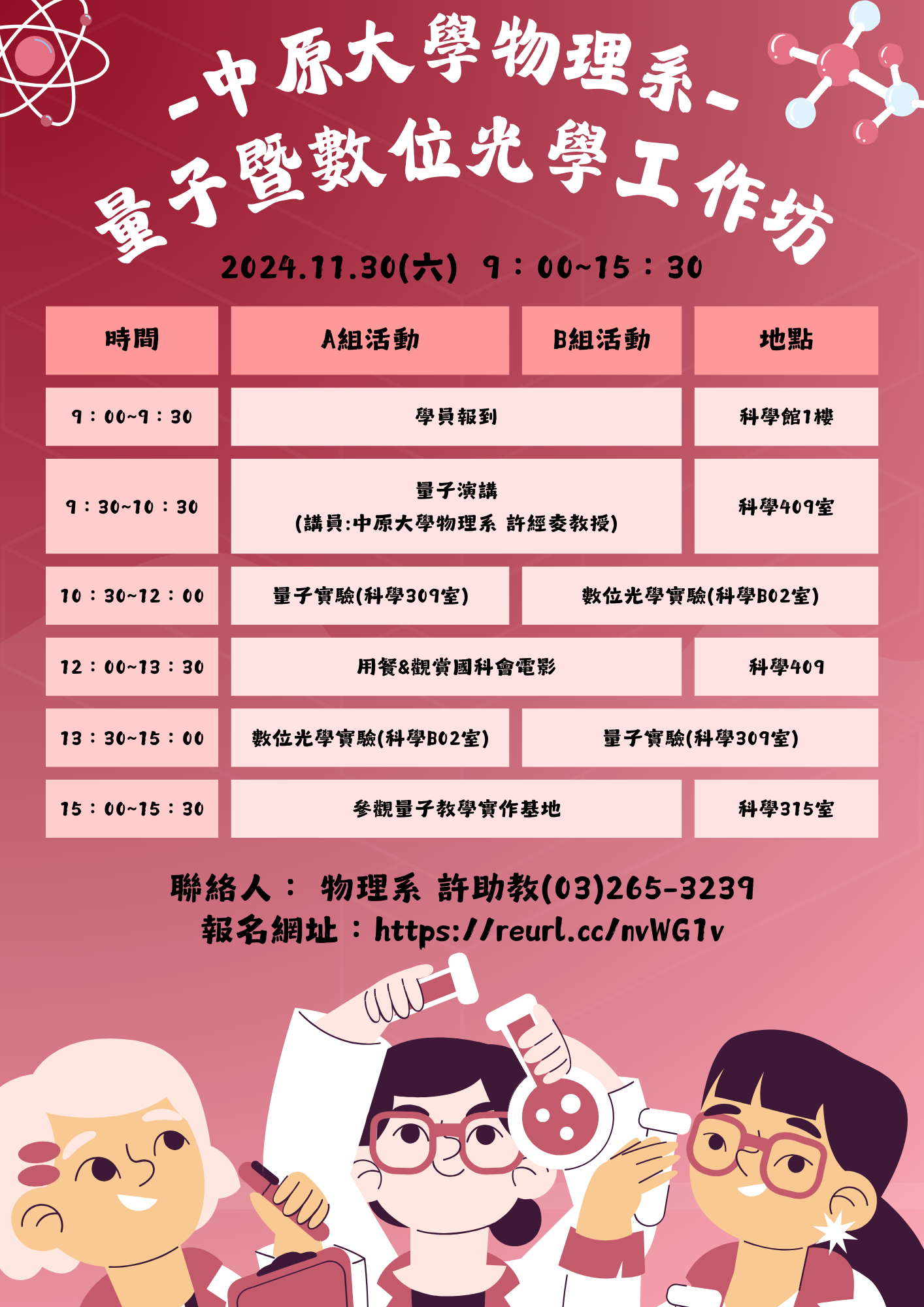 轉知中原大學物理學系113年11月30日(星期六)舉辦「量子 暨數位光學工作坊」活動