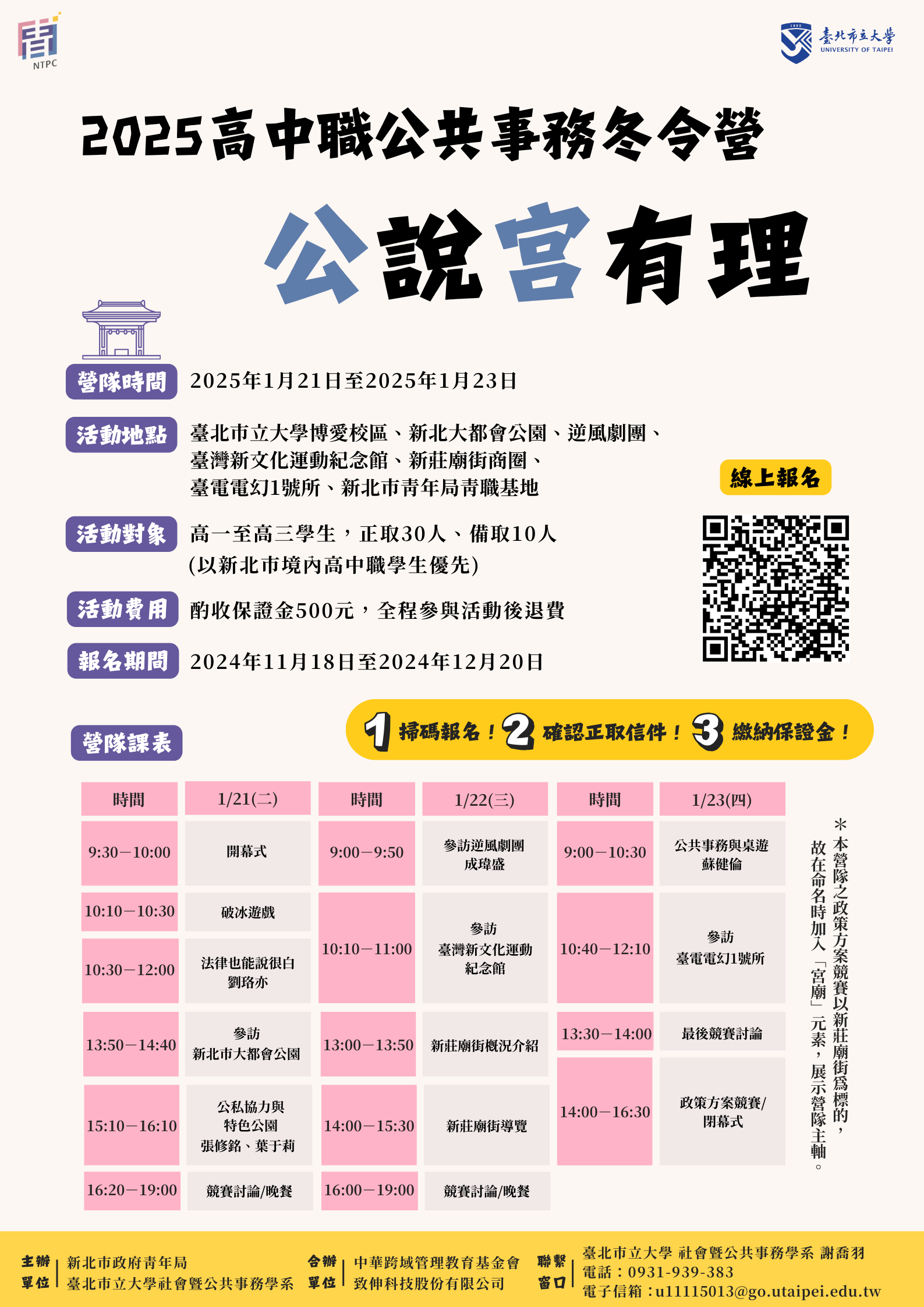 一、旨揭課程詳細資訊如下:(一)課程簡介:1、提升年輕學子公共參與相關知能,提升公共事務視野高度及實踐力,並了解公共事務並積極參與社區服 務。2、本營隊將透過多元面向的專家演講(如:公私協力概念介紹、逆風劇團運作及介紹、新莊廟街概 況介紹、法律知識等)、政策方案競賽、移地教學等活動,激發年輕學子對公共事務的創意及想法,並提供學生一 個公共參與的管道與實踐平臺。(二)時間:114年1月21日至1月23日(三)對象:現就讀各公私立高級中學及高級職業學校學生。(四)師資:法律白話文運動社群總監劉珞亦、新北市政府水 利局副局長張修銘、天母夢想公園提案人葉于莉、逆風劇團團長成瑋盛、桃園市立壽山高中歷史老師蘇健倫。(五)學費:僅酌收500元保證金,全程參與者退還保證金。(六)網路報名:1、請掃描營隊海報中的QR CODE。2、報名期間:113年11月18日(星期一)至113年12月20 日(星期五)。
