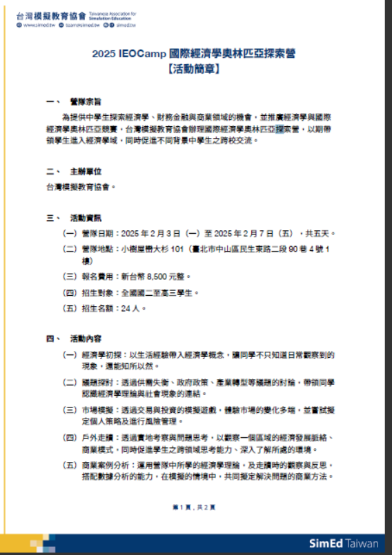 一、為推廣經濟學教育以及國際經濟學奧林匹亞競賽,台灣模擬教育協會訂於114年2月3日(一)至2月7日(五)辦理「國際經濟學奧林匹亞探索營」。