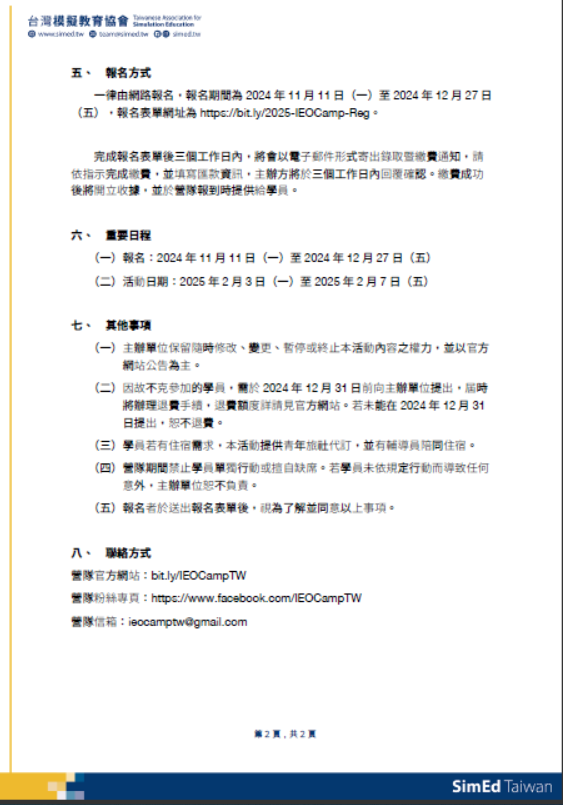 二、本營隊採線上報名,報名網址為bit.ly/2025-IEOCamp-Reg。報名期間為即日起至114年1月3日(五)止,歡迎學生踴躍參加。