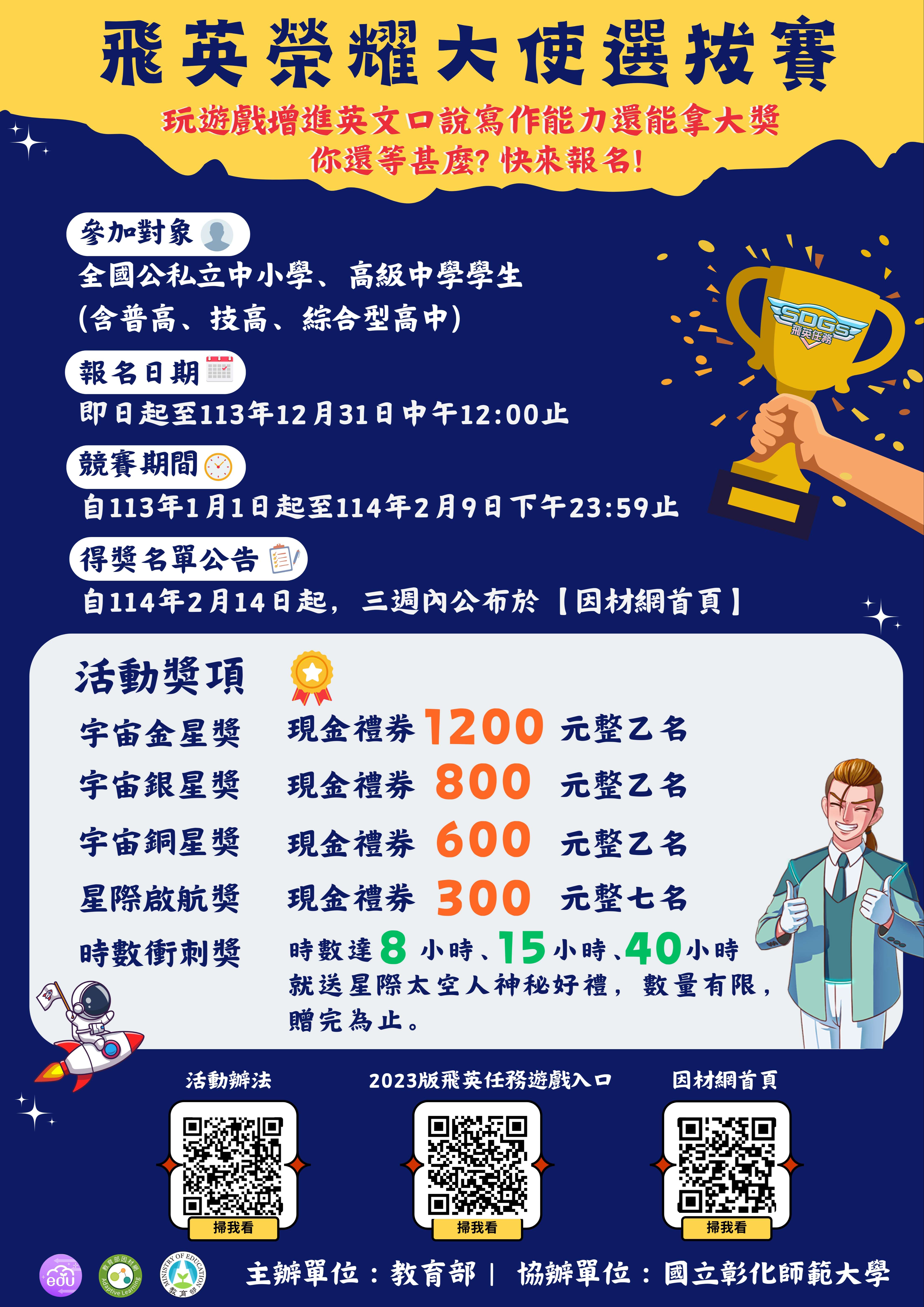二、為提升全國中小學及高級中學學生英語口說與寫作能力, 教育部『高中英語文口說及寫作遊戲開發與推廣計畫』推出「SDGs 飛英大使年度排行榜積分賽」,邀請學生成為「飛英大使」。該遊戲式教材結合SDGs主題影片與互動任 務,旨在幫助學生提升聽力、口說及寫作能力,並激發持 續運用平台素材的英語學習動機。