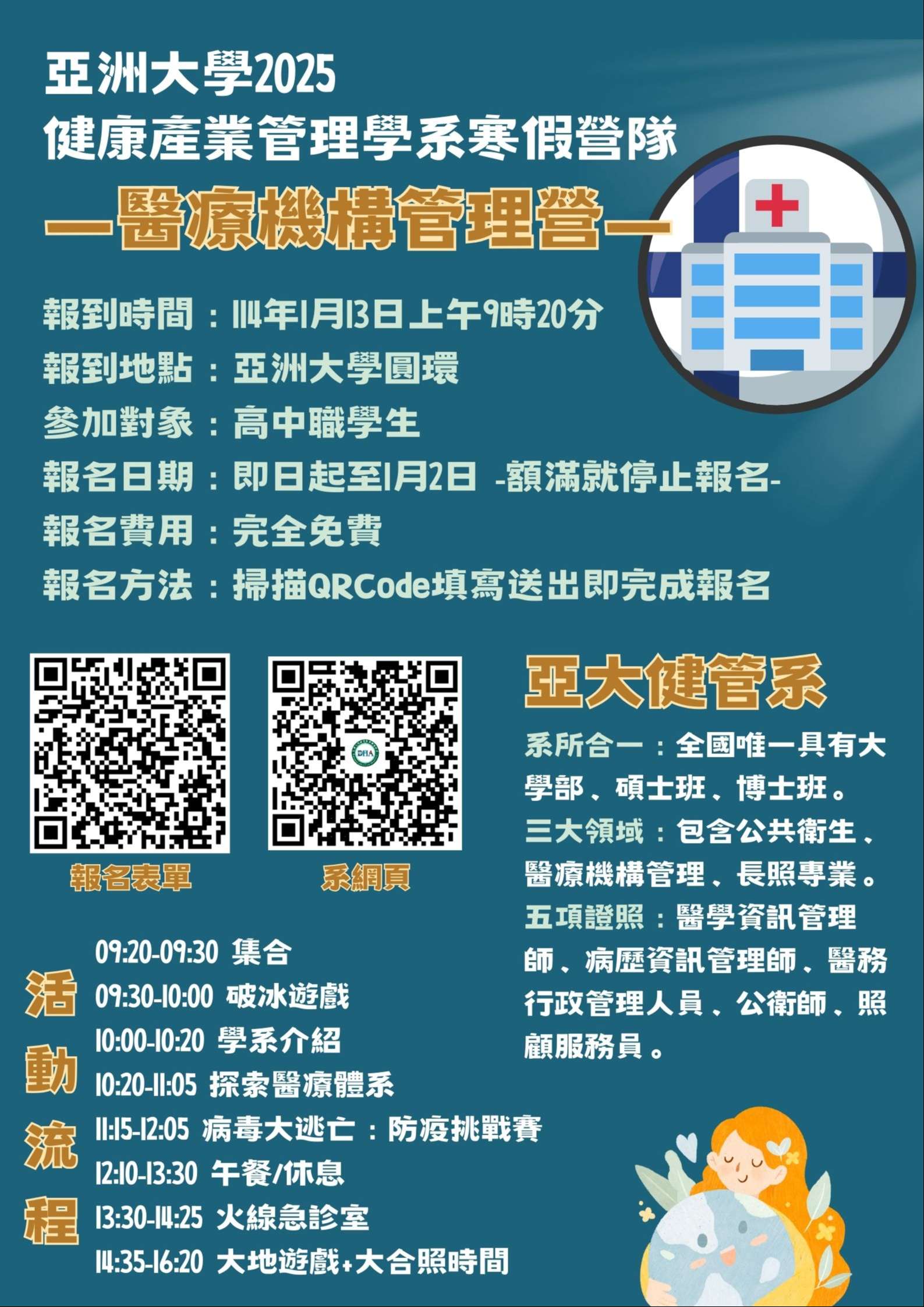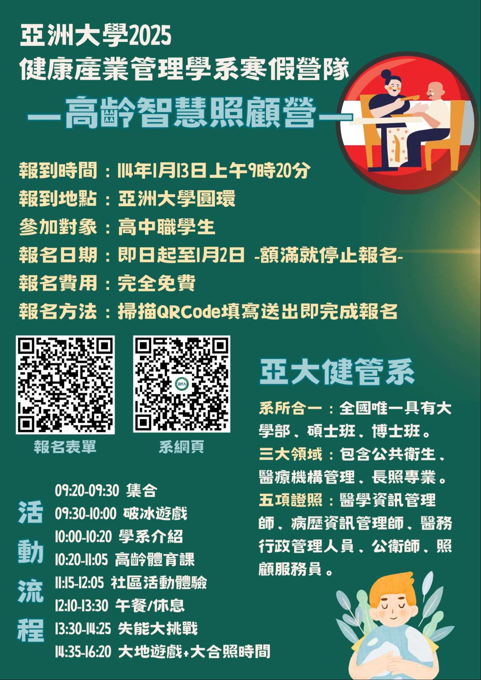 活動資訊: (一)活動時間:114年1月13日。 (二)相關活動訊息及報名方式請參閱營隊海報,報名網址如下: 1.高齡智慧照顧營 2.醫療機構管理營