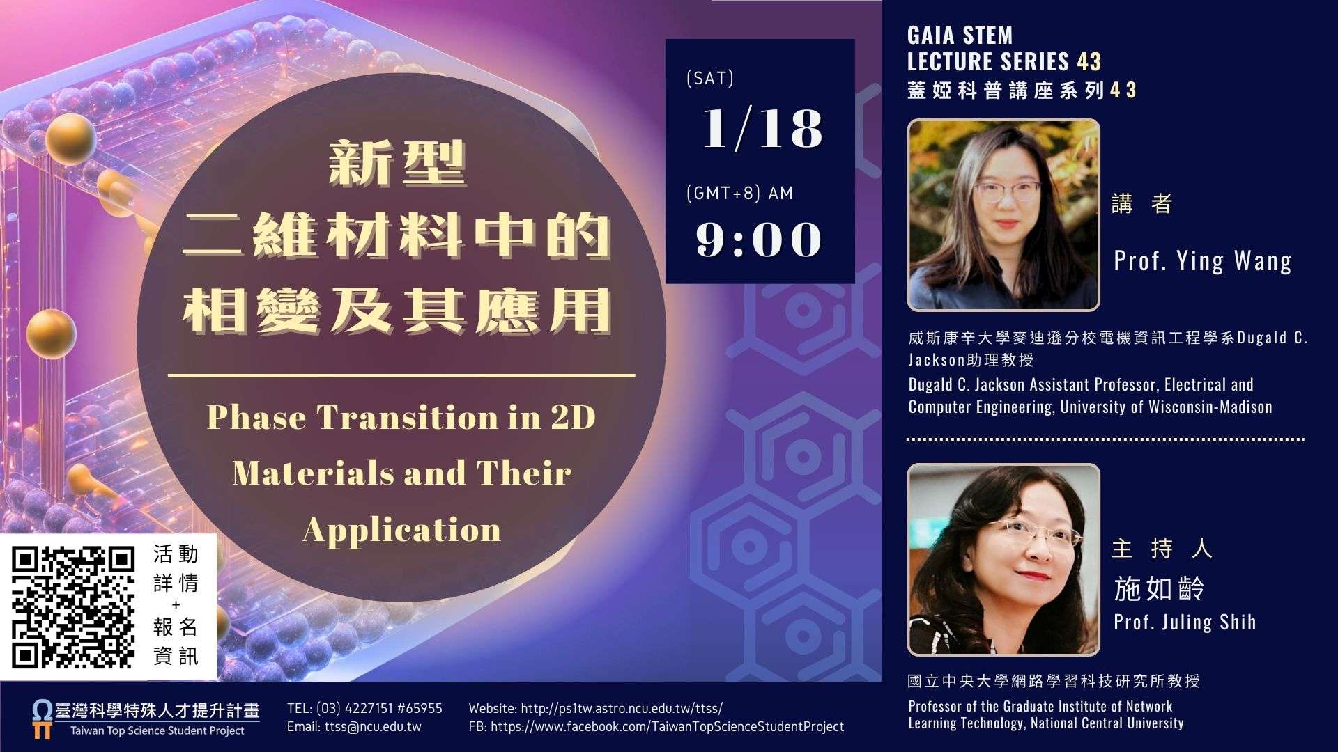 轉知國立中央大學訂於114年1月18日辦理線上講座:《蓋婭科普講座系列 43》—— 「新型二維材料中的相變及其應用」