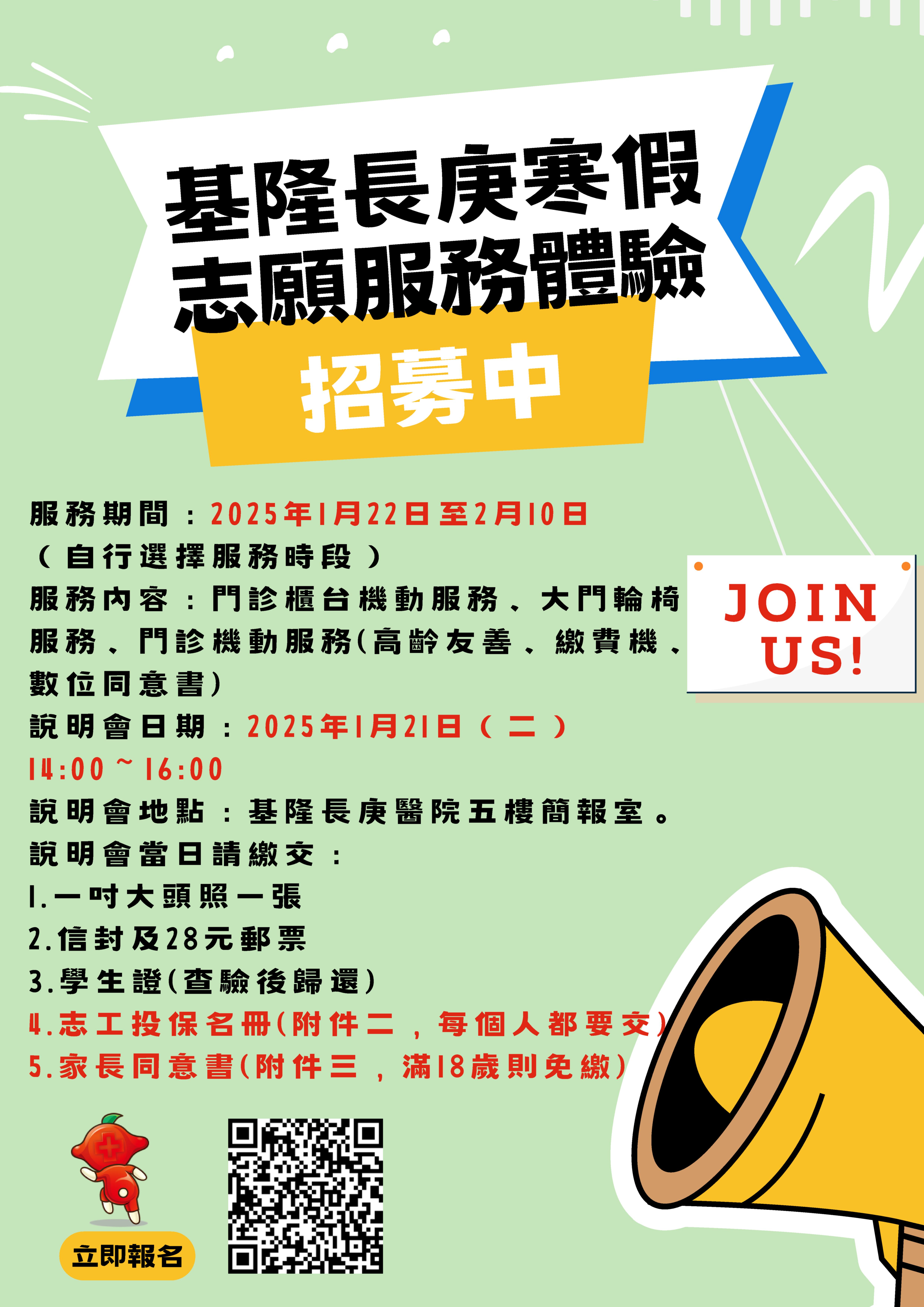 轉知長庚醫療財團法人基隆長庚紀念醫院寒假短期志工招募訊息: