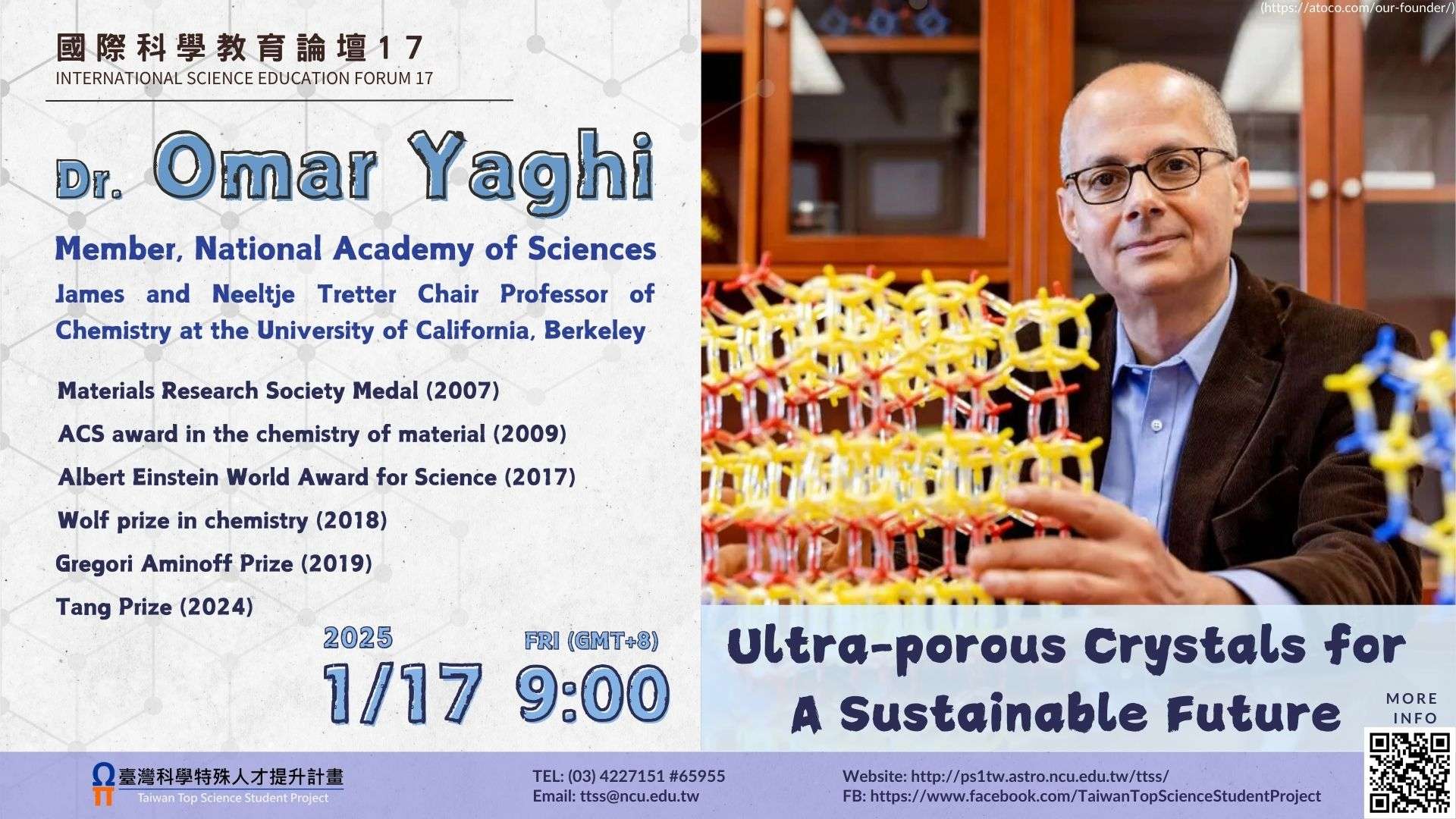 轉知國立中央大學訂於114年1月17日辦理線上講座:《國際科學教育論壇系列17》—— 「Ultra-porous crystals for a sustainable future」