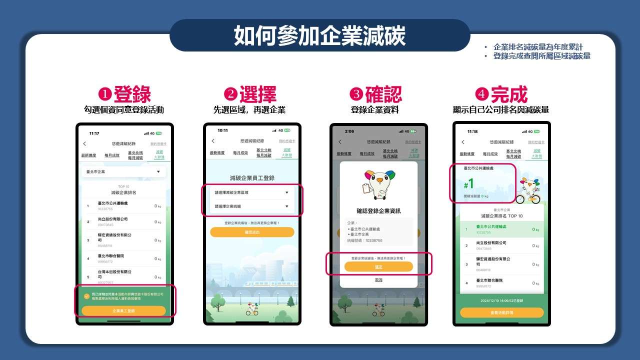 二、114年更擴大開放基北北桃四市企業、機關及學校共同參與 「減碳大聯盟」,各市累積減碳量前5名單位可獲表揚,特 邀請貴機關及單位加入並鼓勵所屬員工參與(活動加入步驟如附件1及附件2),如有意願請至連結(https://www. surveycake.com/s/Q23qL)填妥相關資訊,誠摯邀請貴機 關及單位加入響應。
