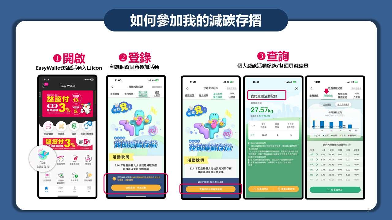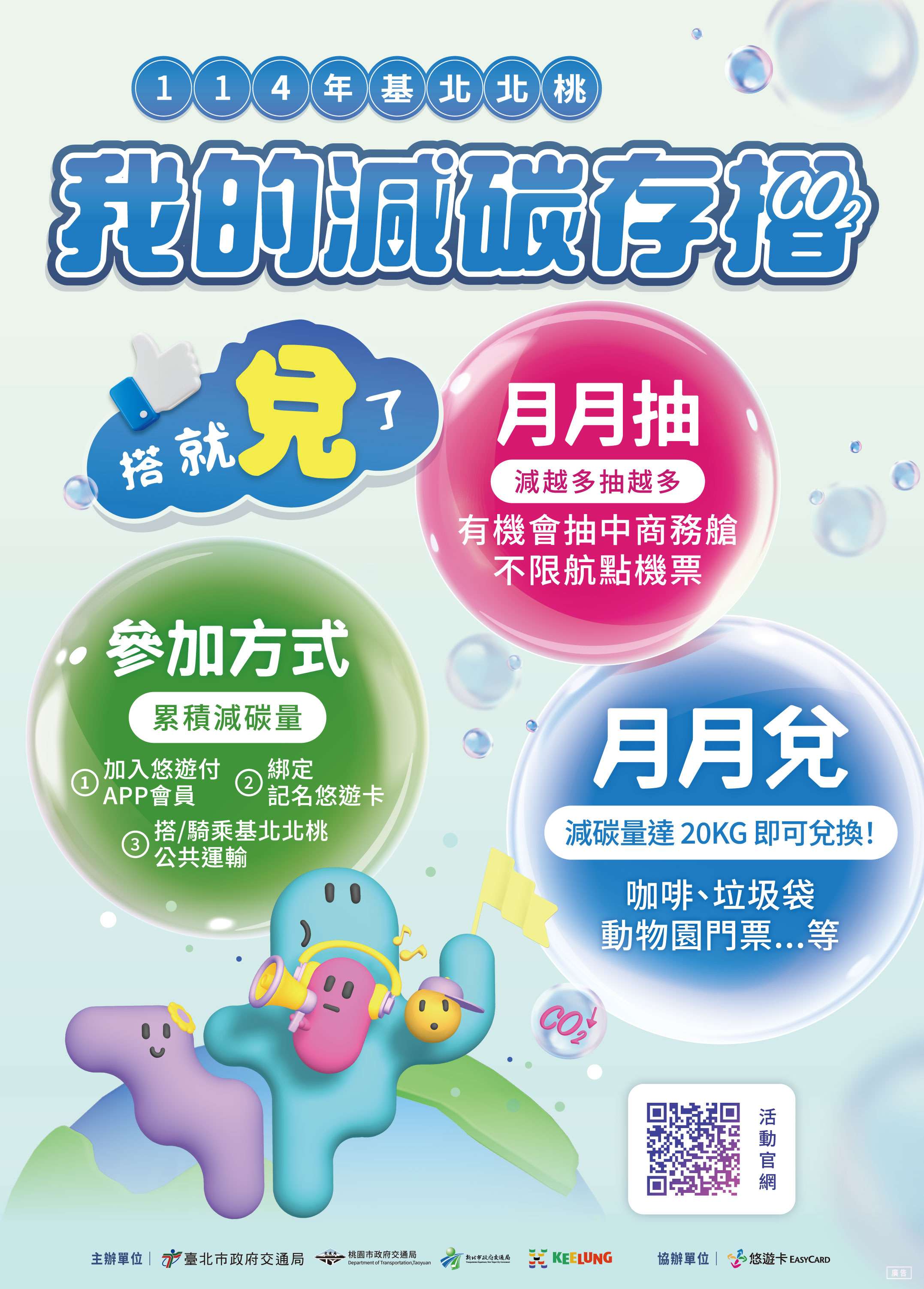 一、為攜手市民多加使用公共運輸,以朝淨零碳排目標前進, 由政府、企業一起帶動全民綠運輸減碳,113年由基北北桃 四市交通單位、公共運輸業者及悠遊卡股份有限公司共同 推動,114年度擴大辦理並增加兌獎制活動,民眾累積達一 定減碳量即可登錄兌換獎項,提高民眾參與誘因,活動辦 理期間114年1月1日至12月31日止,詳細內容可至本活動官 網查閱114年活動資訊(https://co2-passbook.com/)。