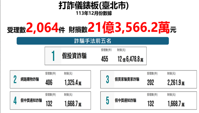 二、分析本市113年12月各類詐欺案件發生數共計2,064件,前 3 大詐欺手法及件數如下: