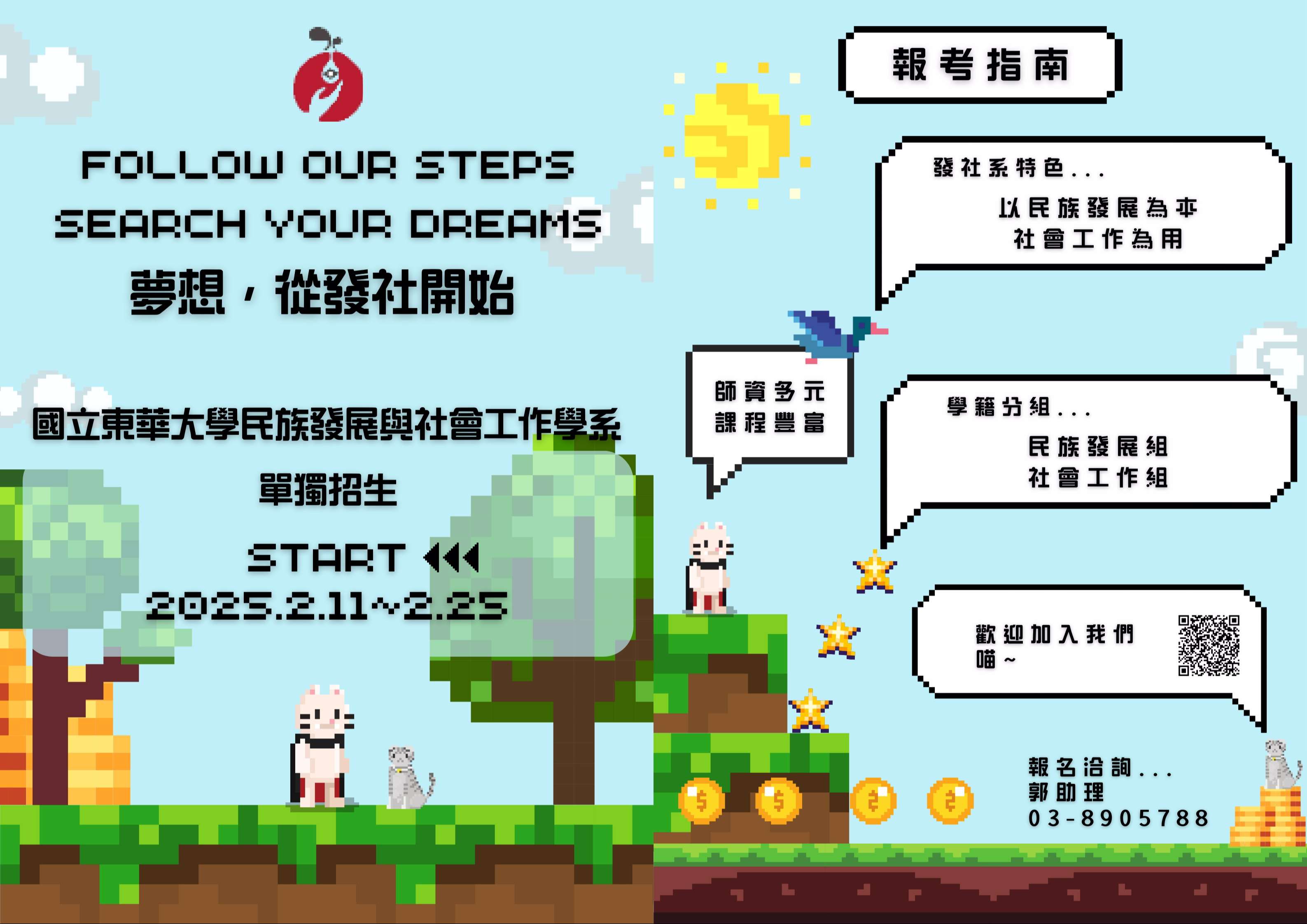 欲更加了解該校發社系,歡迎加入或關注發社系FB社團(搜尋:國立東華大學民族發展與社會工作學系);相關問題歡迎逕與該校發社系辦公室聯絡,電話:03-8905788,EMail:tefi@gms.ndhu.edu.tw,或加入發社系官方LINE群組(Line ID搜尋@503pwyqr)詢問。