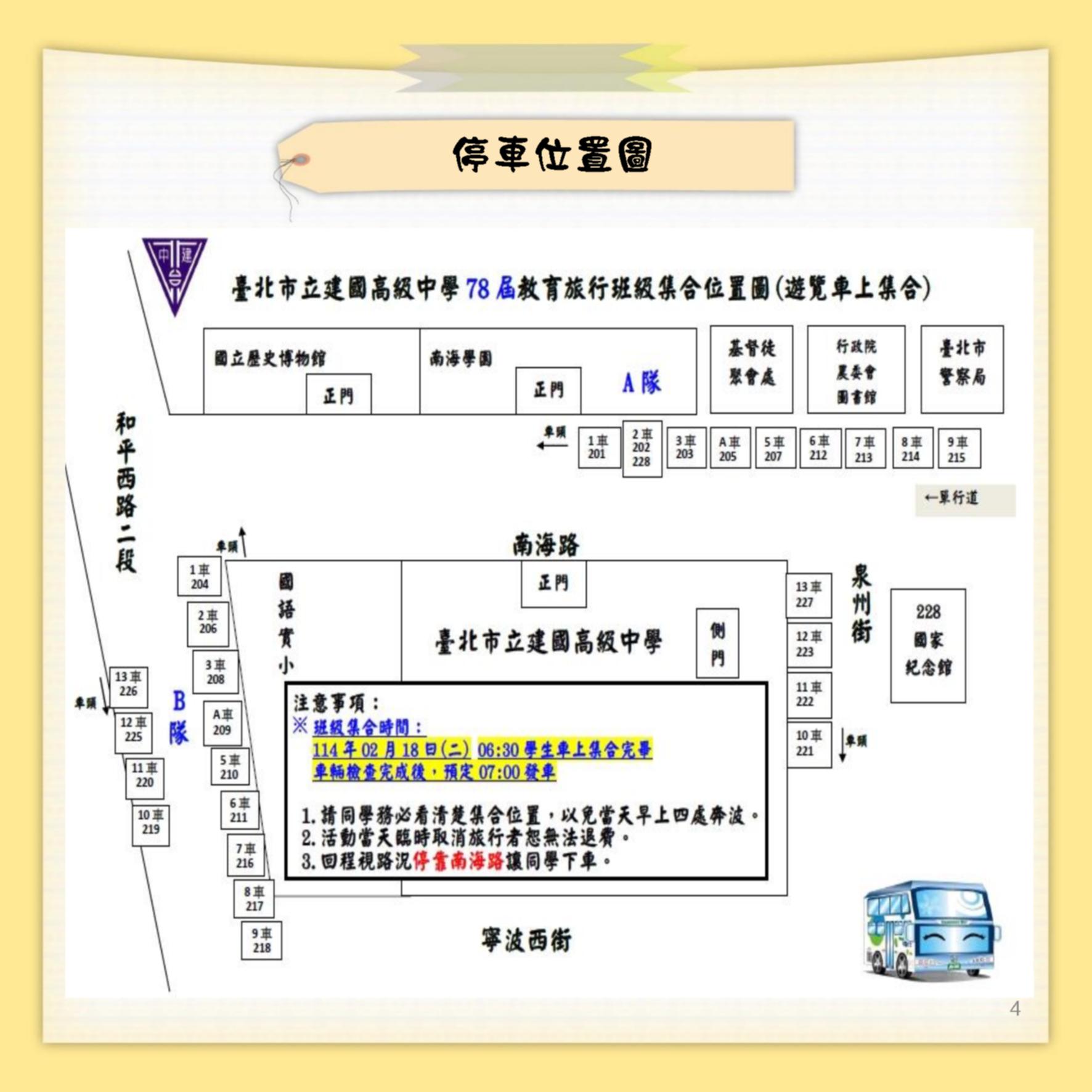 (2)返回:預計2/21(五)夜間19:30~20:30左右,AB梯隊所有班級車次,依行進順序,陸續返回南海路校門,就地解散。