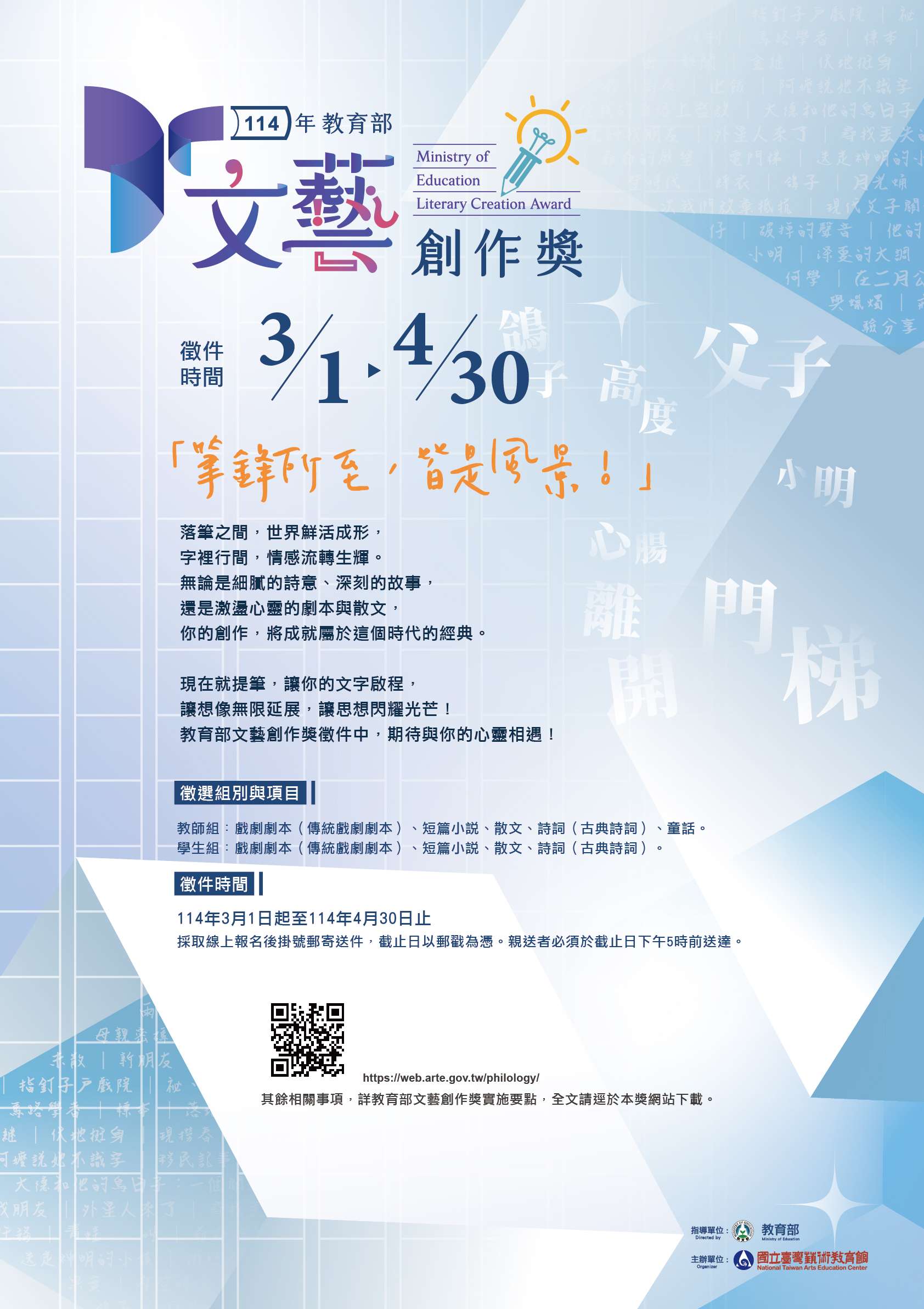 國立臺灣藝術教育館114年教育部文藝創作獎自本(114)年3月1日起開始 徵件,請踴躍參加。