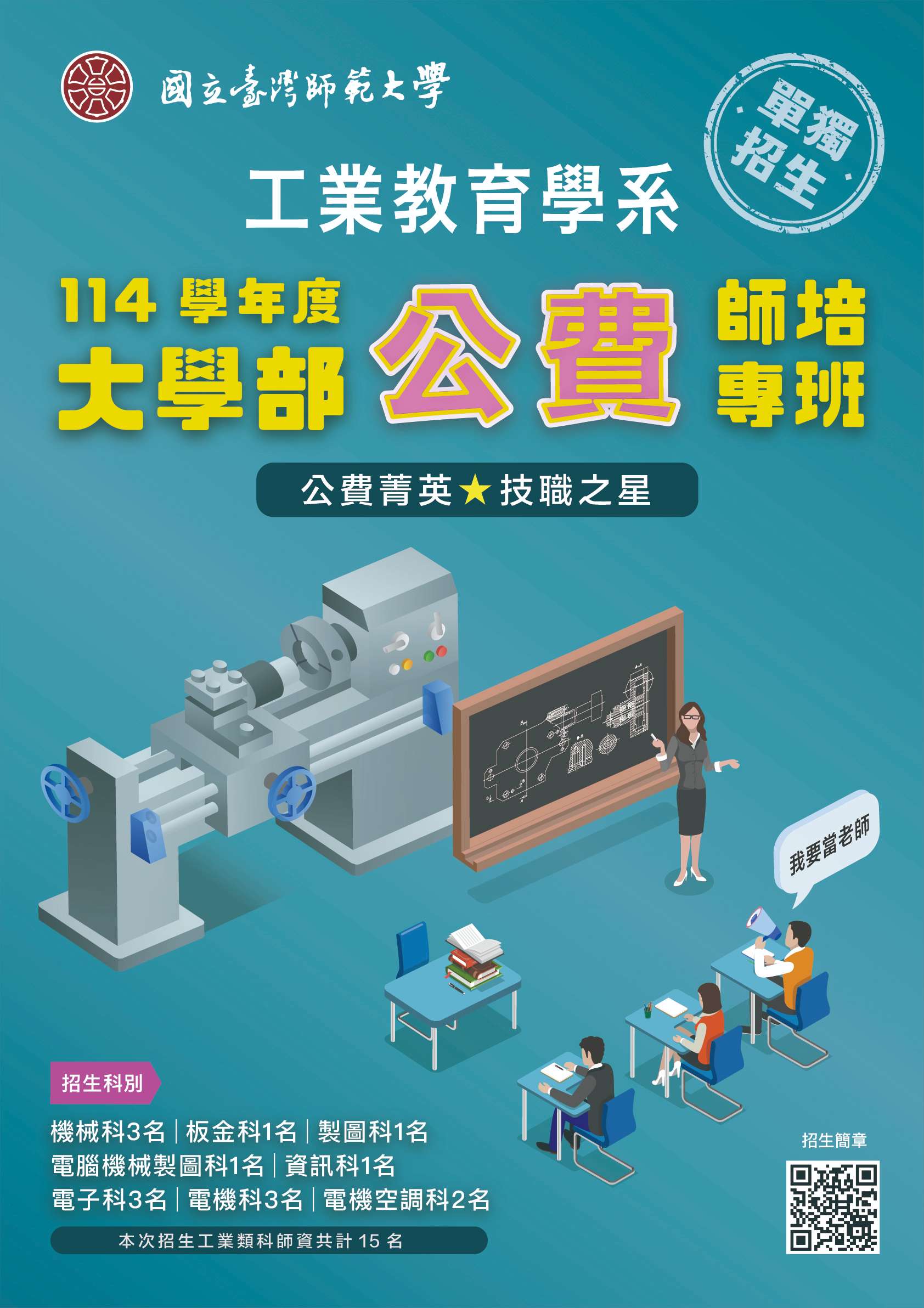 檢附該校114學年度工業教育學系學士班公費專班單獨招生招生簡章及海報各乙份。