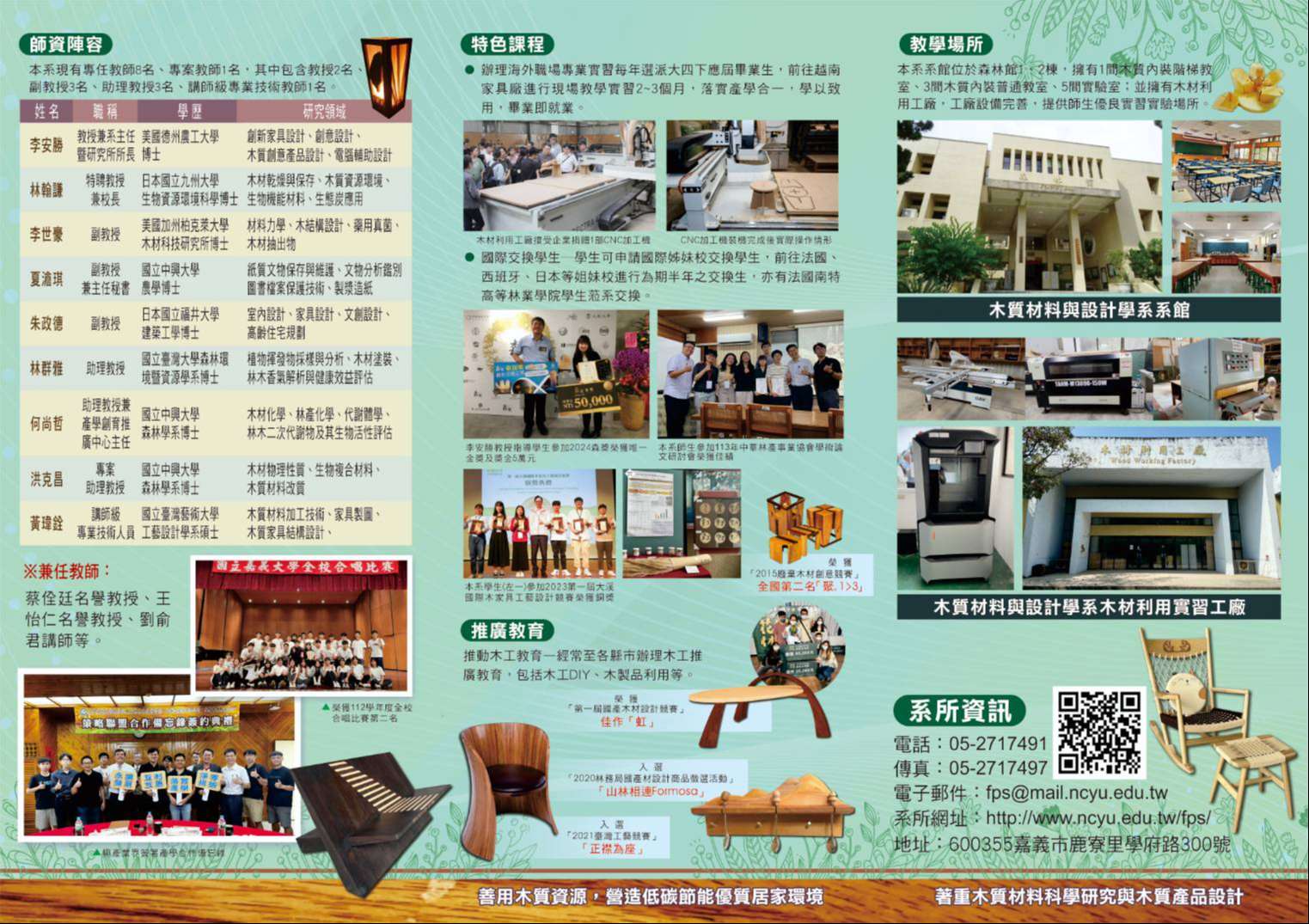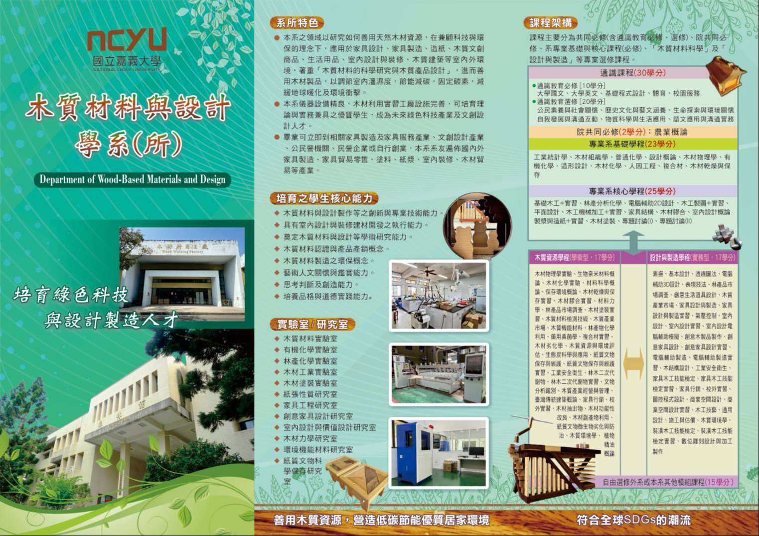 (一)該系主要研究如何善用天然木材資源,在兼顧科技與環保理念下,應用於家具設計、家具製造、造紙、木質文創商品、生活用品、室內設計與裝修、木質建築等室內外環境,「著重木質材料的科學研究與木質產品設計,以培養綠色科技與設計製造產業人才,並結合固碳、減碳的環保政策,以符合SDGs世界潮流」。