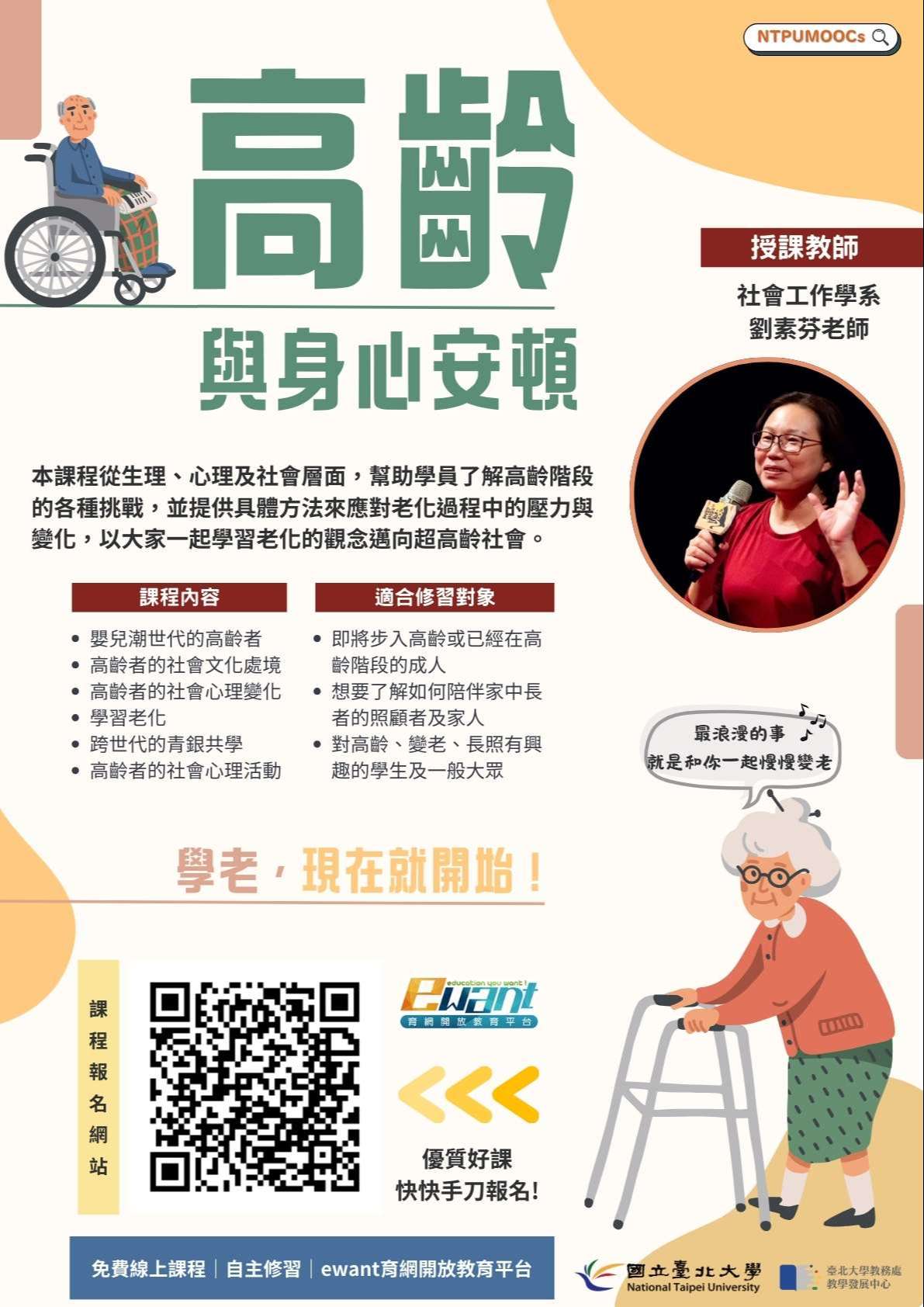 2、課程內容:「高齡與身心安頓」課程在探討隨著年齡 增長,個人如何在身心兩方面進行調適,達到更平衡 的生活狀態。本課程從生理、心理及社會層面,幫助 學員了解高齡階段的各種挑戰,並提供具體方法來應 對老化過程中的壓力與變化,以大家一起學習老化的 觀念邁向超高齡社會。