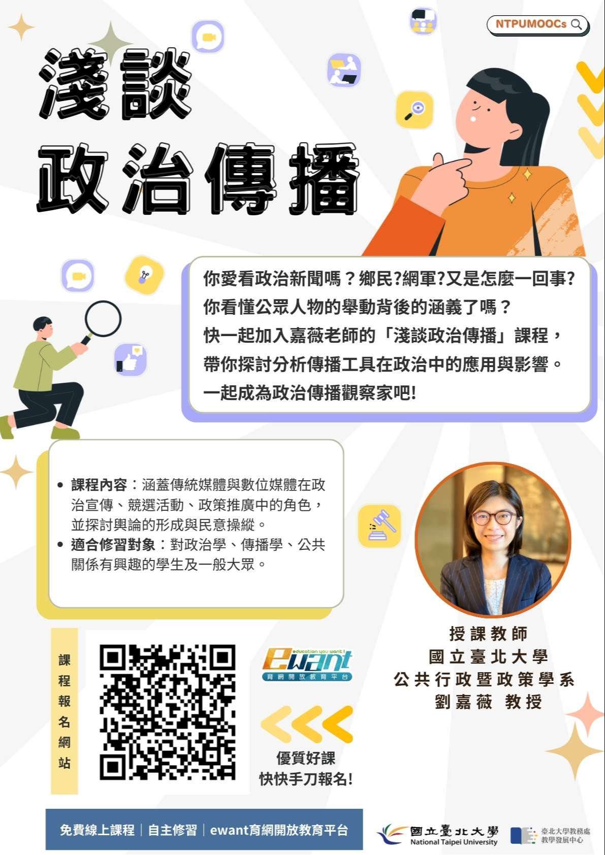 2、課程內容:「淺談政治傳播」課程旨在探討政治與傳 播的交集,分析各種傳播工具在政治中的應用與影 響。課程內容涵蓋傳統媒體與數位媒體在政治宣傳、 競選活動、政策推廣中的角色,並探討輿論的形成與 民意操縱。此課程適合對政治學、傳播學、公共關係 有興趣的學生。