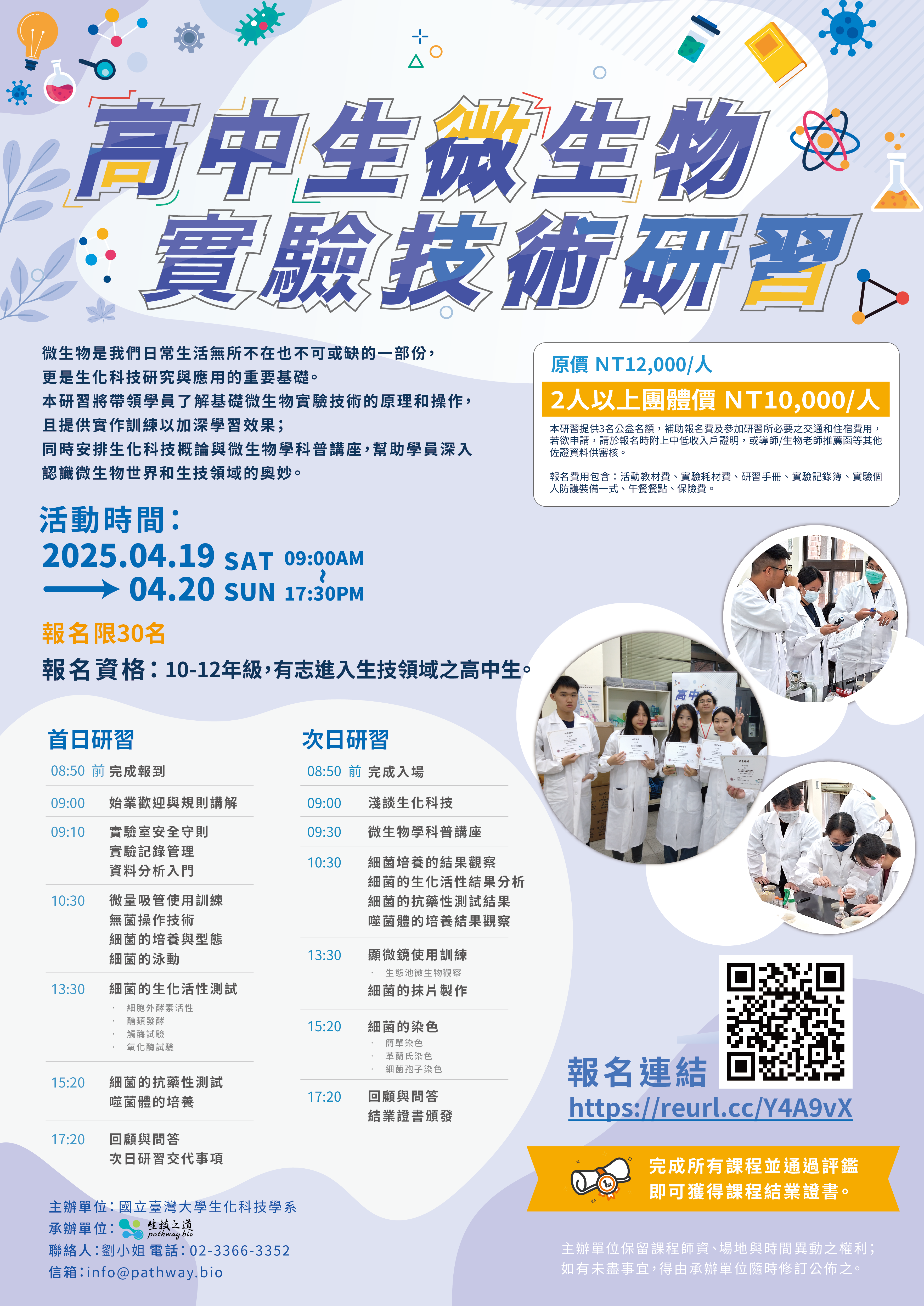 活動將利用週末兩日時間,帶領學員了解基礎微生物 實驗技術的原理和操作,並提供實作訓練加深學習效果, 同時安排生化科技概論與微生物學科普講座,讓有志進入生技領域的同學能及早掌握關鍵實驗技術和知識。詳情請參閱附件海報。