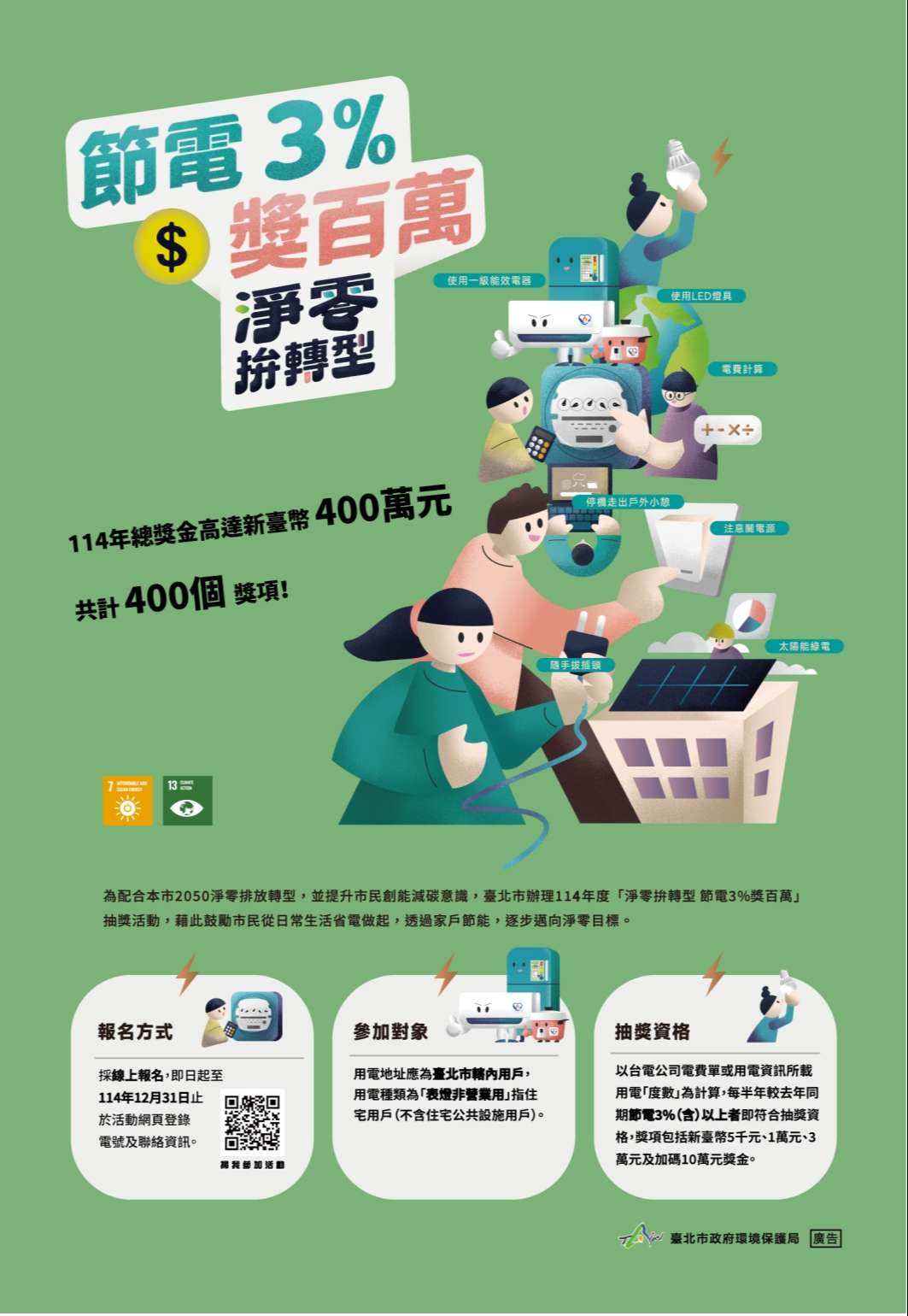 一、為鼓勵市民落實節能減碳行動,本局114年「淨零拚轉型節 電3%獎百萬」抽獎活動(網址:https://energysaving. gov.taipei/),即日起至114年12月31日辦理,提供活動 海報及30字、60字、90字文稿,請貴機關學校協助運用所 屬管道(電子看板、跑馬燈、廣播插播稿等)宣傳登錄電 號。 二、跑馬燈文稿內容如下,請參酌使用: