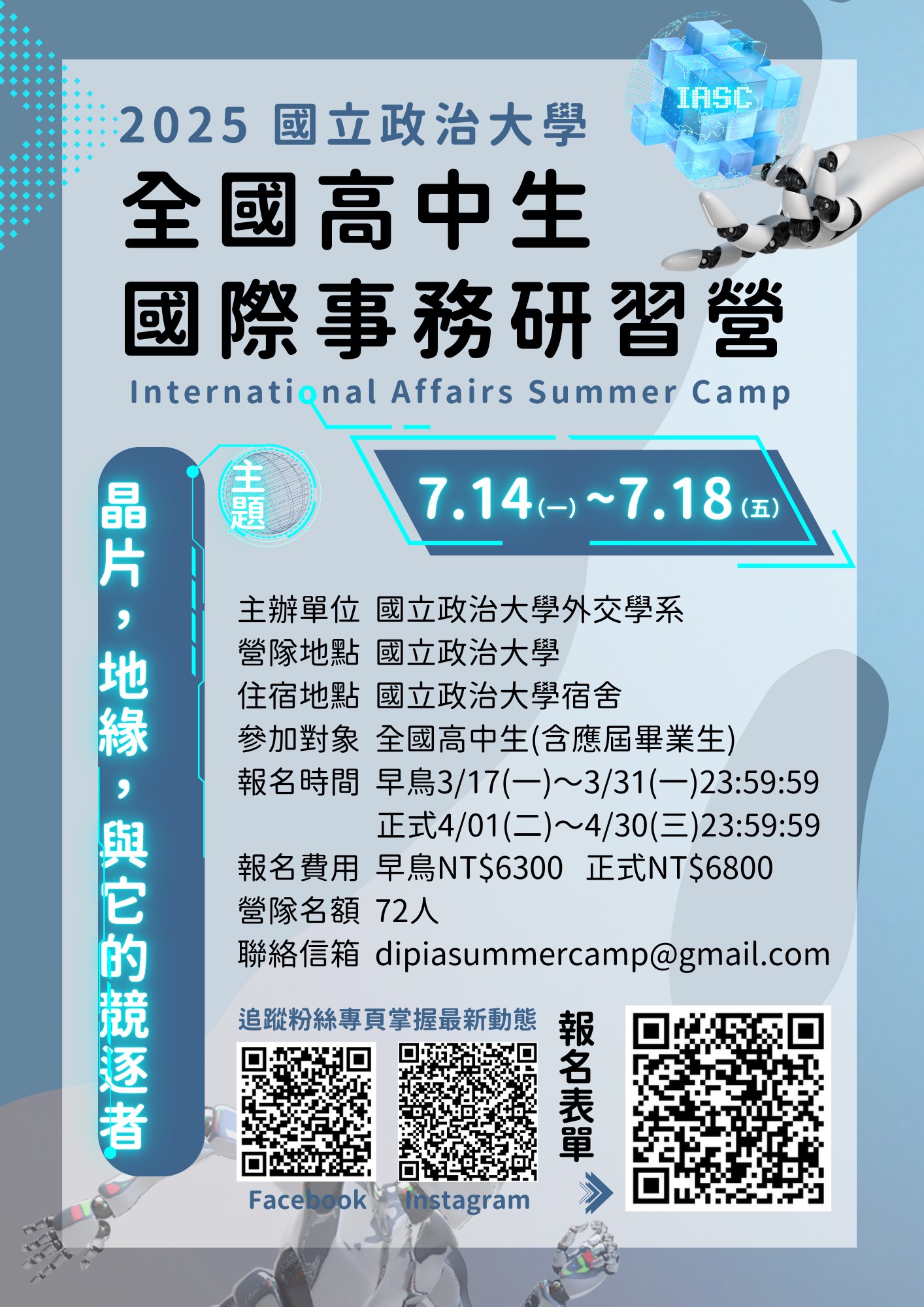 三、檢送活動海報電子檔,可自行影印使用,敬請惠予協助宣傳並鼓勵學生踴躍參加。相關活動資訊請上活動官方臉書 粉絲專頁或Instagram頁面查詢或FB搜尋「2025全國高中生國際事務研習營」;或IG搜尋「2025政大外交國際事務研習營」。