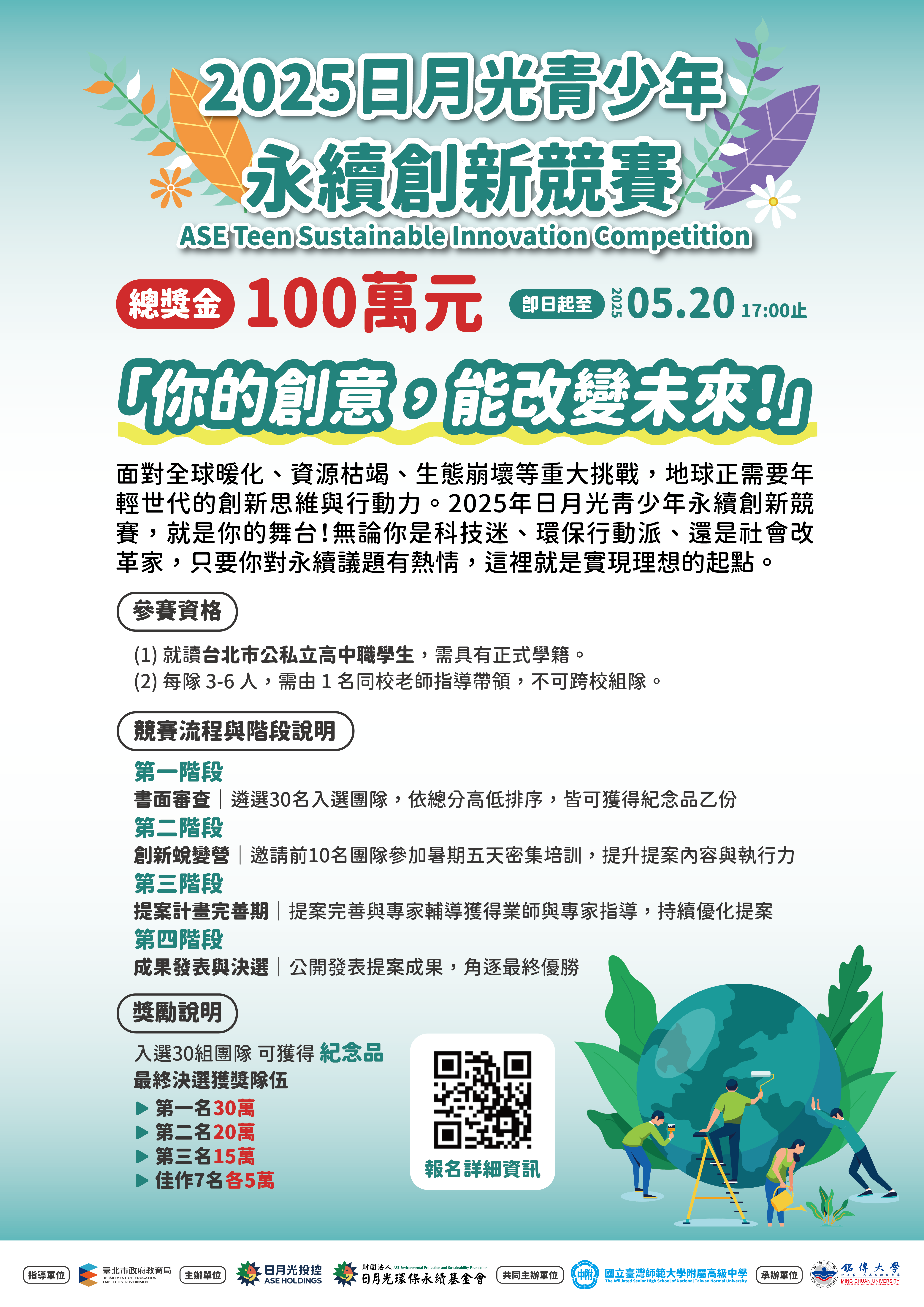 二、日月光基金會為鼓勵學生運用創新思維與跨領域合作,提出具體解決方案,將永續概念轉化為可實踐的行動,自即日起至114年5月20日下午5時止受理旨揭競賽報名,以鼓勵對永續議題有熱情者將理想付諸行動。