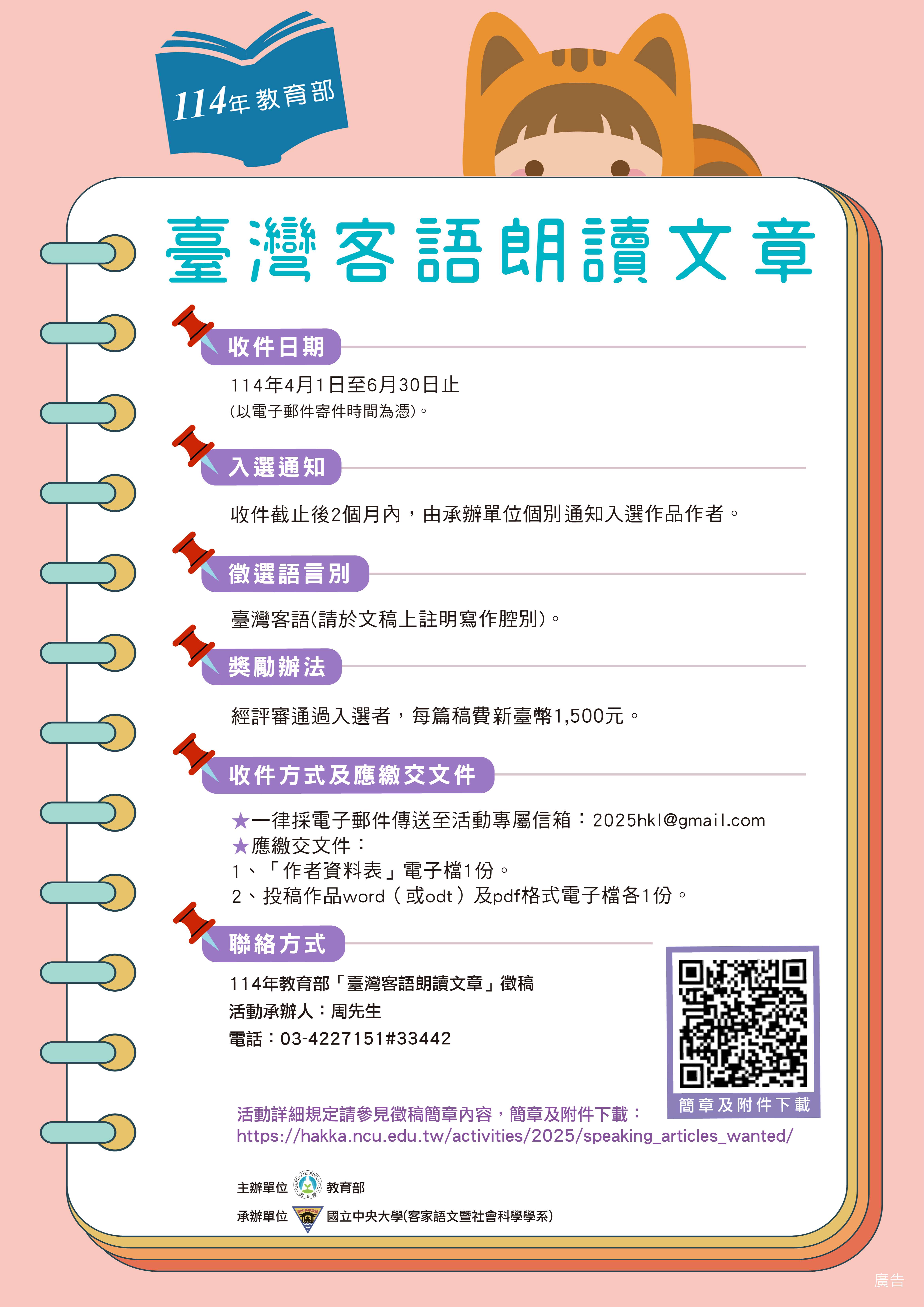 一、為符合全國語文競賽實施要點之競賽宗旨,加強推行語文 教育,活化臺灣客語學習與應用,並擴大參與對象,特舉 辦「臺灣客語朗讀文章」徵稿活動。