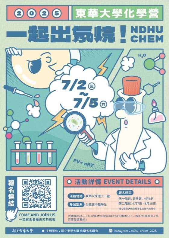 轉知國立東華大學化學系於暑假7月2日-7月5日辦理化學營隊活動