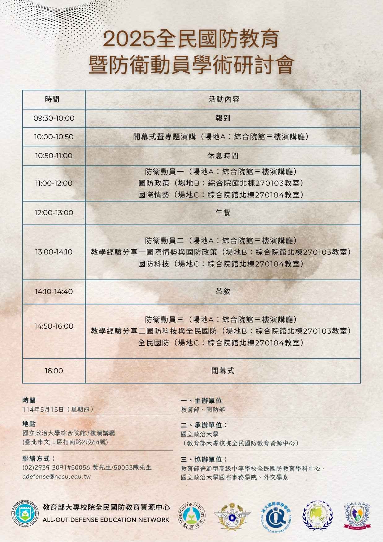 七、聯絡資訊:「教育部大專校院全民國防教育資源中心」學術組―黃先生,電話:(02)29393091分機50056。「教育部大專校院全民國防教育資源中心」行政組―陳先生,電 話:(02)29393091分機50053。