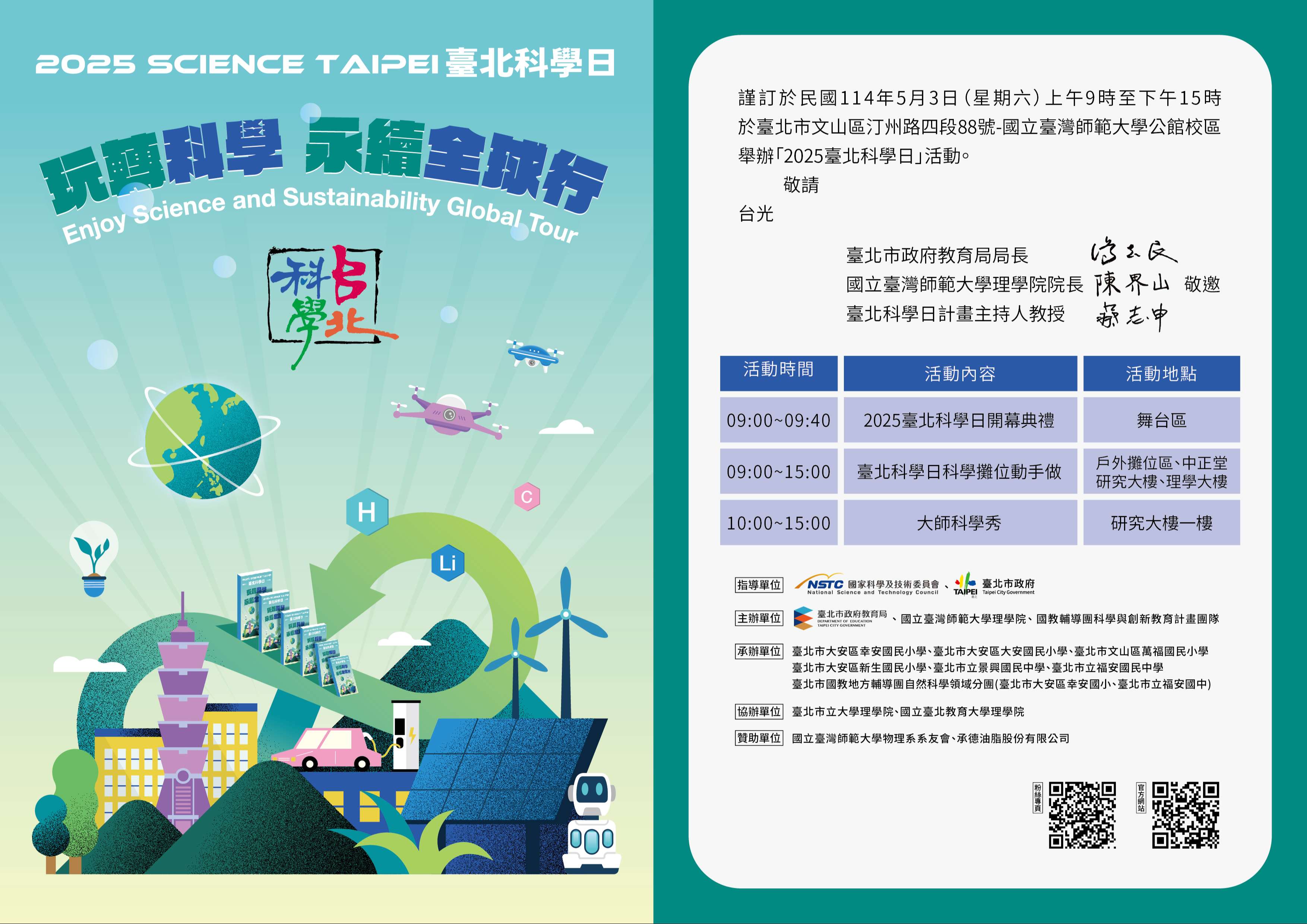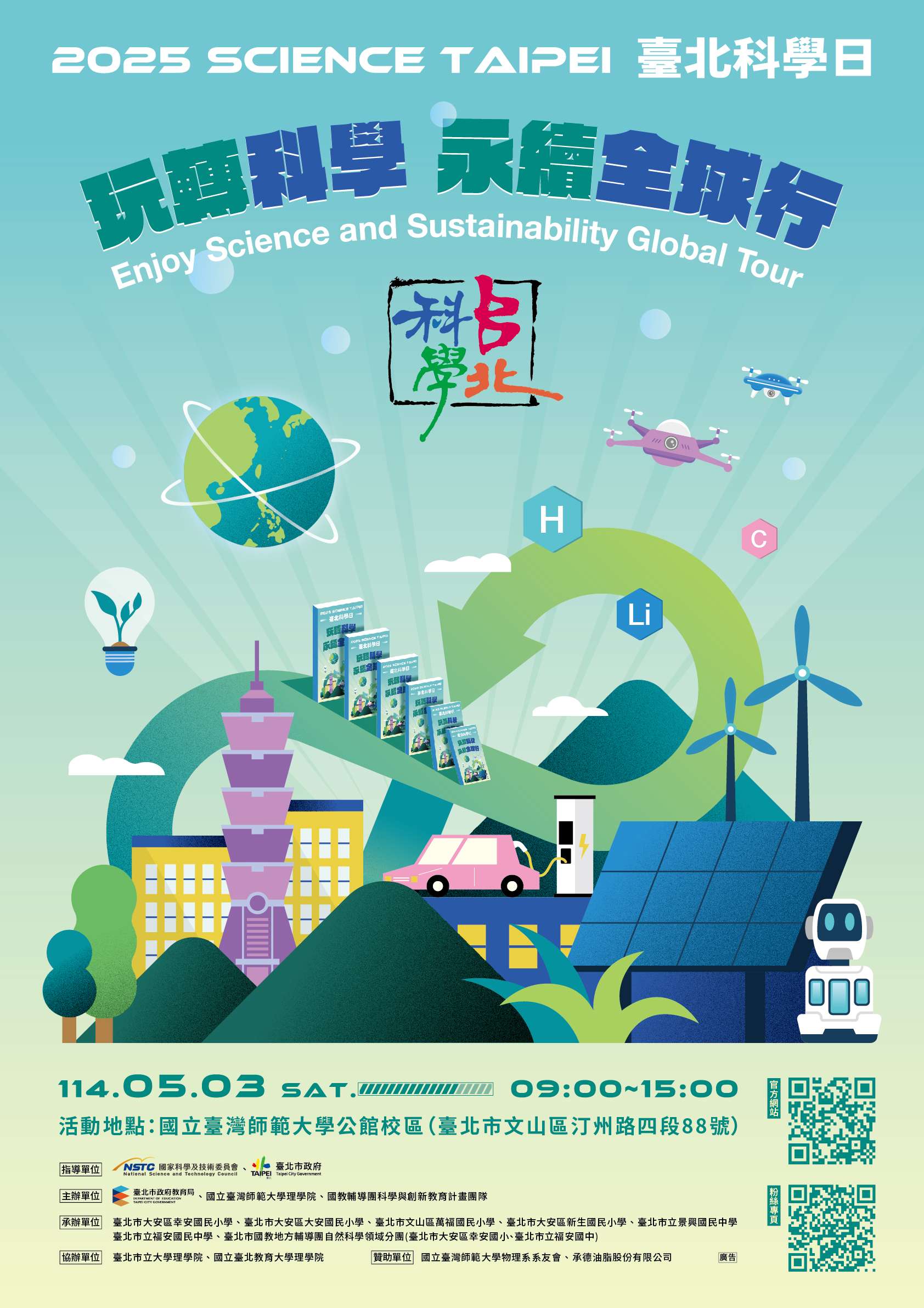 一、臺北市政府教育局與國立臺灣師範大學理學院物理學系合作舉辦,本年度將於114年5月3日(星期六)假師大公館校區辦理科學體驗實作活動,並響應聯合國教育科學及文化組織「永續發展國際十年(IDSSD)」理念,藉本活動「玩轉科學-永續全球行」之主題,彰顯本市對於推動科學教育的重視。
