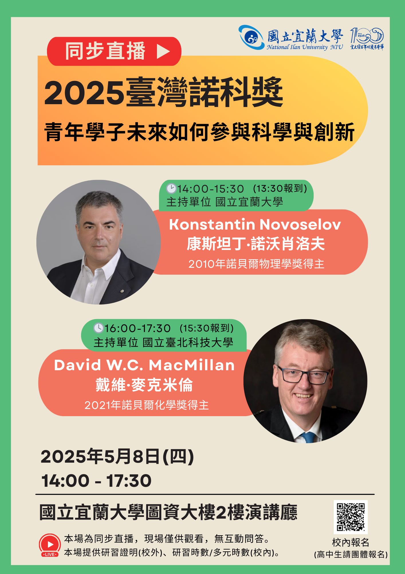 二、國立宜蘭大學獲邀主持114年5月8日(星期四)下午2時「諾貝爾物理學獎大師有約」場次,並邀請中央研究院副院長周美吟院士擔任與談嘉賓。同時於本校圖書資訊館2樓演講廳設置「諾貝爾物理學獎大師有約」及「諾貝爾化學獎大師有約」宜大直播場,歡迎貴校師生踴躍參與。