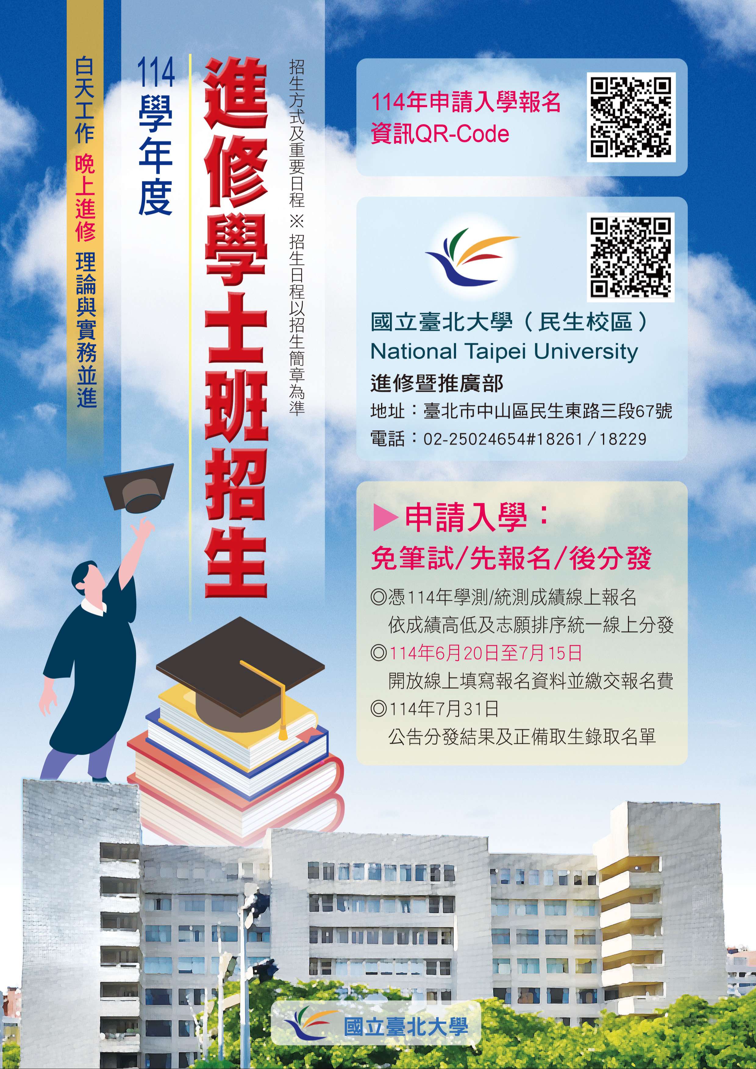 四、本校今年網路報名相關資訊及連結請參閱:https://new. ntpu.edu.tw/eec/bachelor-continuing。
