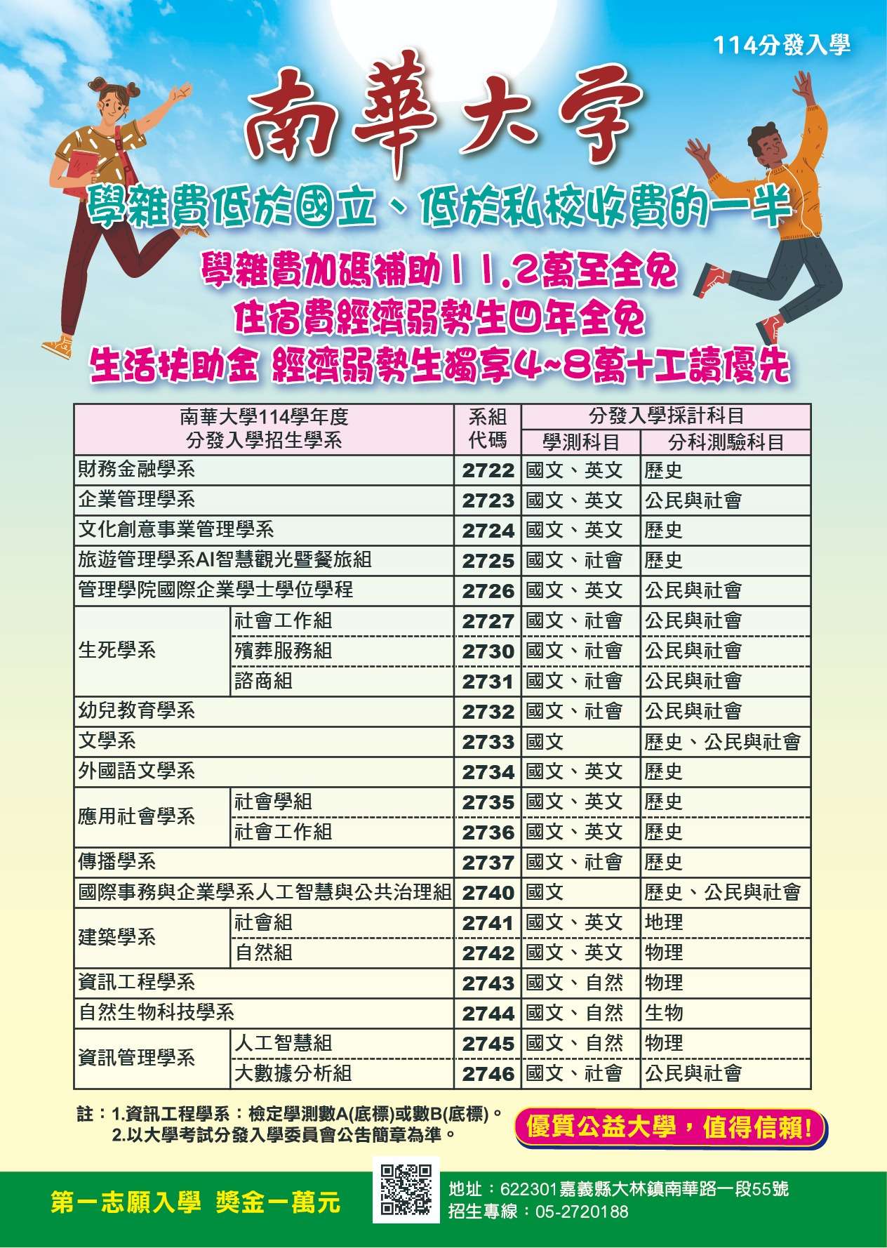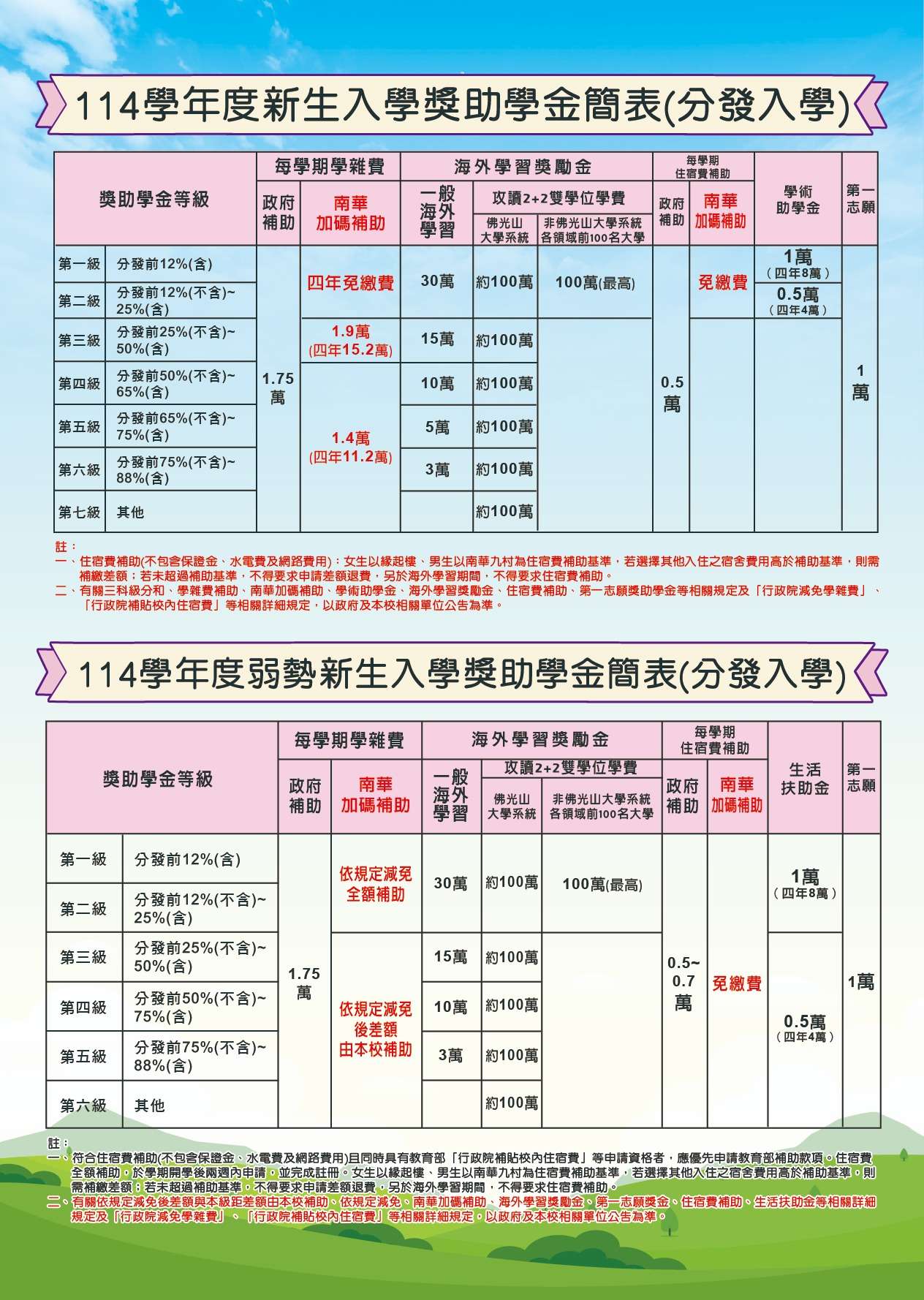 (一) 學雜費補助一般生除政府補助每學年3.5萬外,南華大學加碼補助2.8萬至全免。對於弱勢生,政府依身分別補助從3.5萬至全免不等,南華大學依身份別加碼補助最高約6萬。