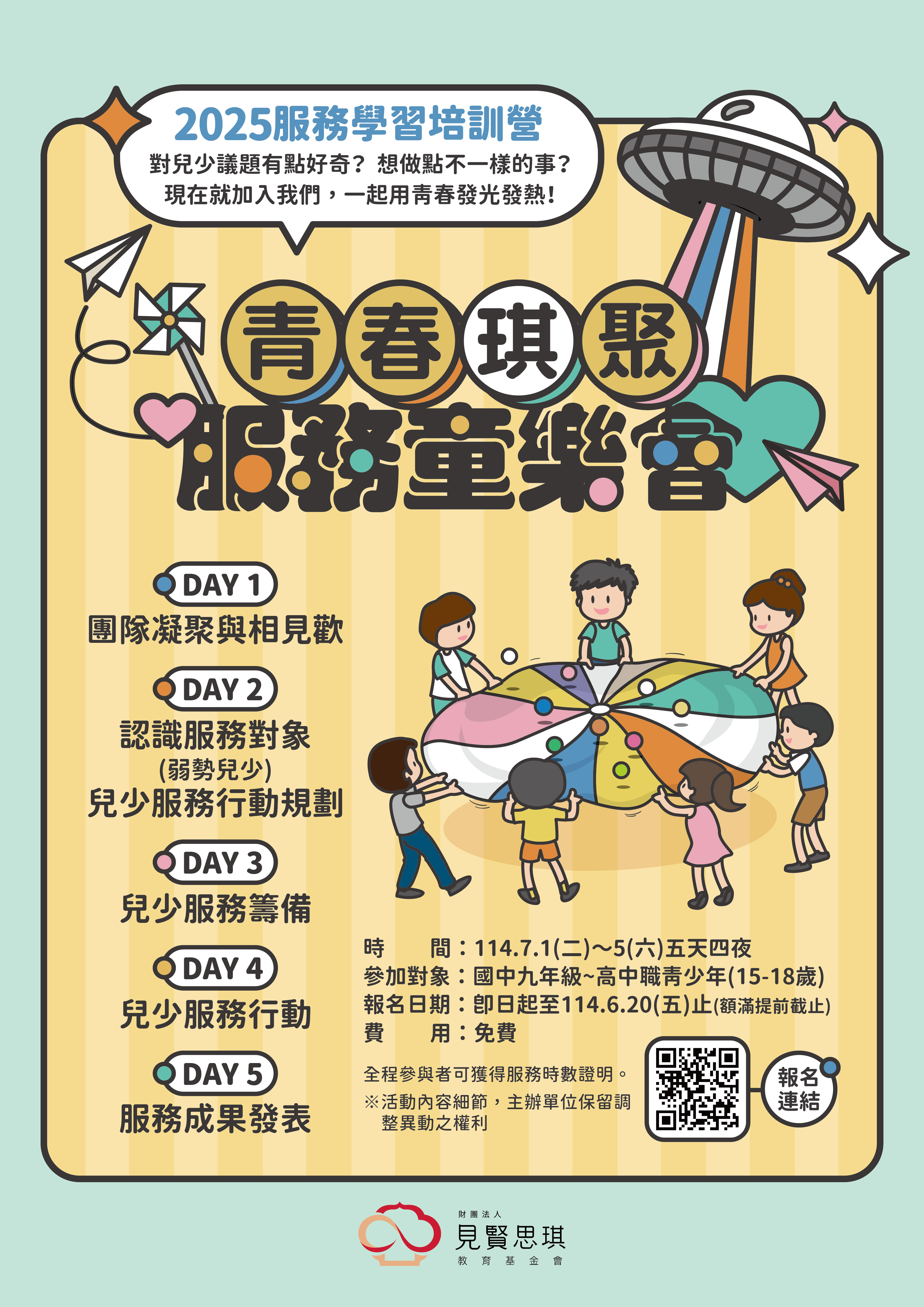 轉知財團法人見賢思琪教育基金會「2025青春琪聚-服務童樂會」暑假服務學習培訓營: