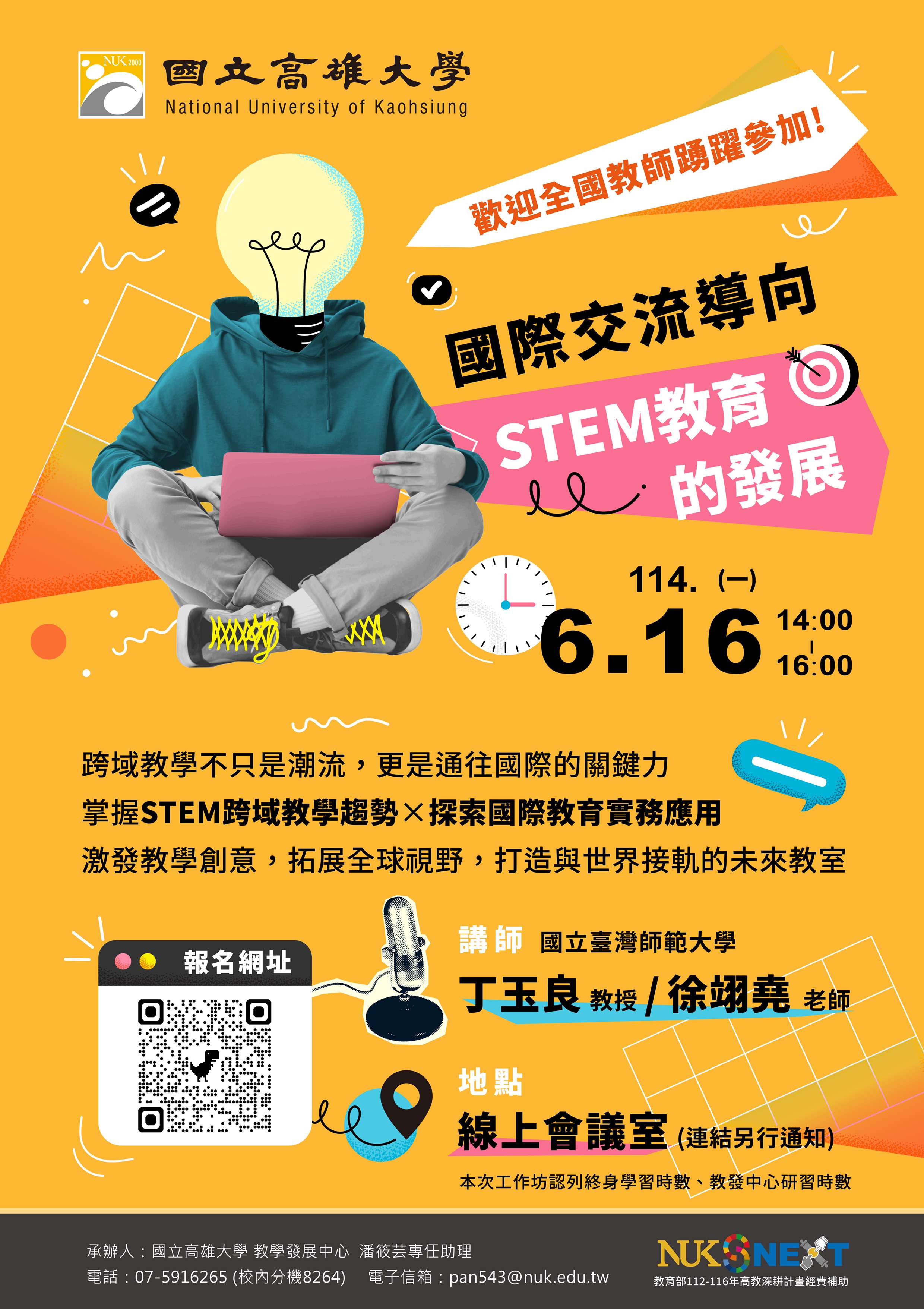 五、聯絡人:本校教學發展中心潘小姐,電話(07)591-6265(分 機8264),Email:pan543@nuk.edu.tw