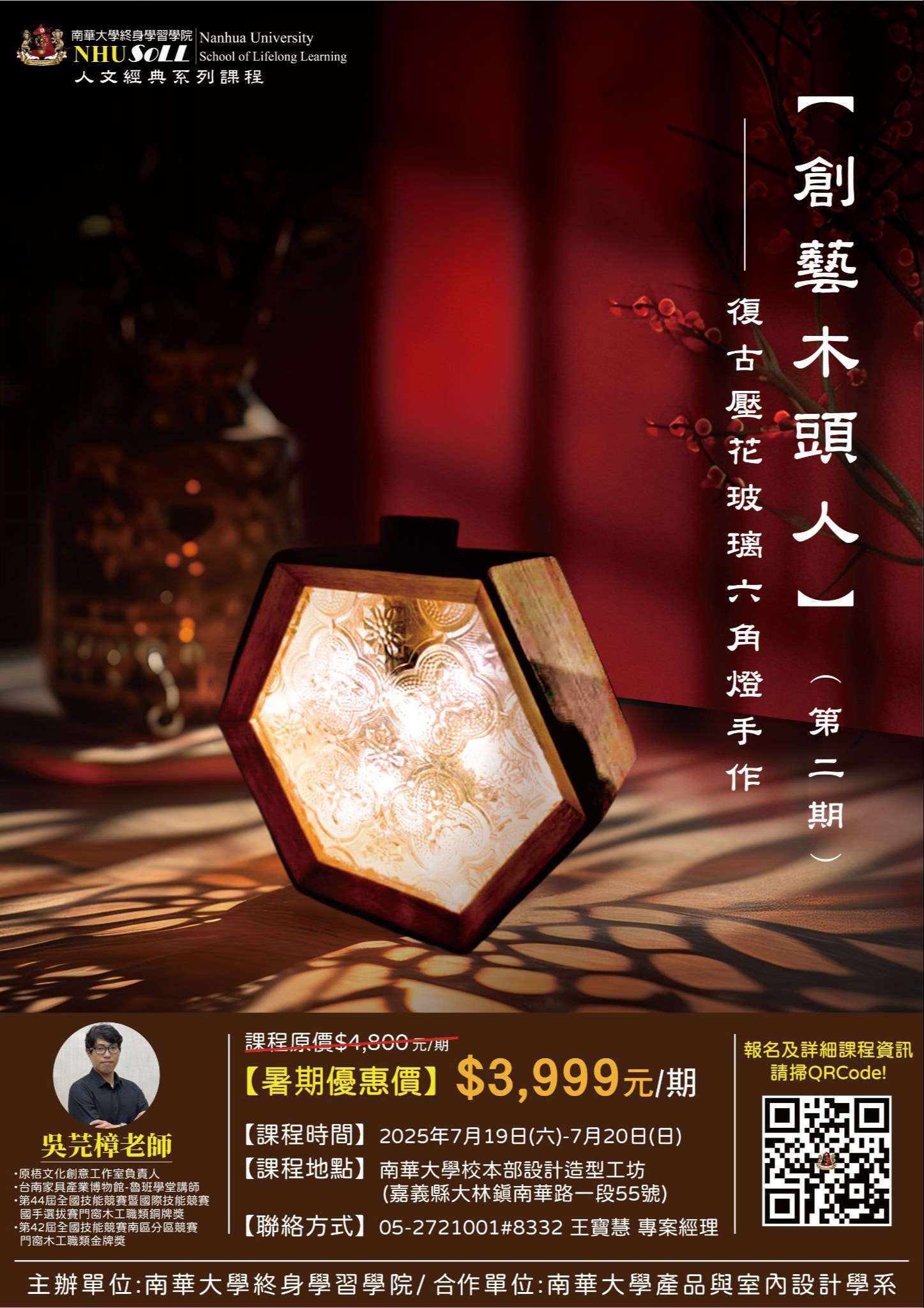 轉知南華大學114年7月份開辦之【創藝木頭人】(第二期):復 古壓花玻璃六角燈手作課程資訊