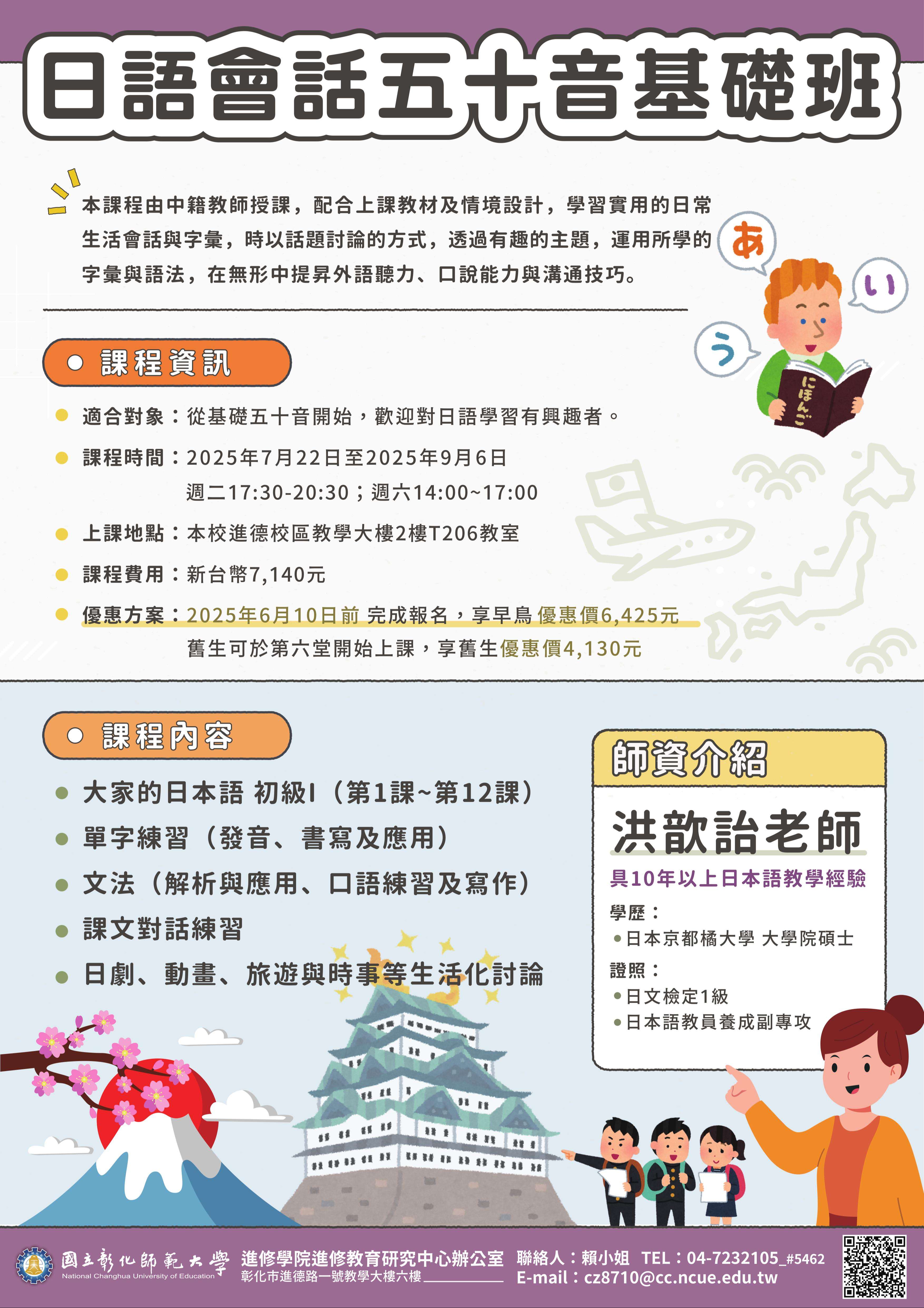 (一)課程特色:本課程從基礎五十音開始教學,適合初學 者。由中籍教師授課,搭配教材及情境設計,學習實用 的生活會話與字彙,逐步提升學員聽力、口說與溝通技 巧。